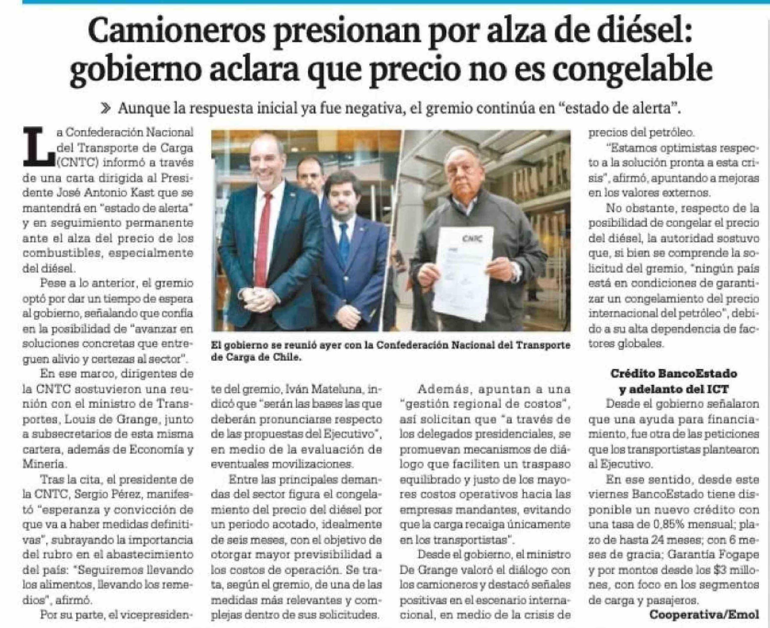 Camioneros presionan por alza de diésel: gobierno aclara que precio no es congelable 18-04-2026 La Prensa Austral |