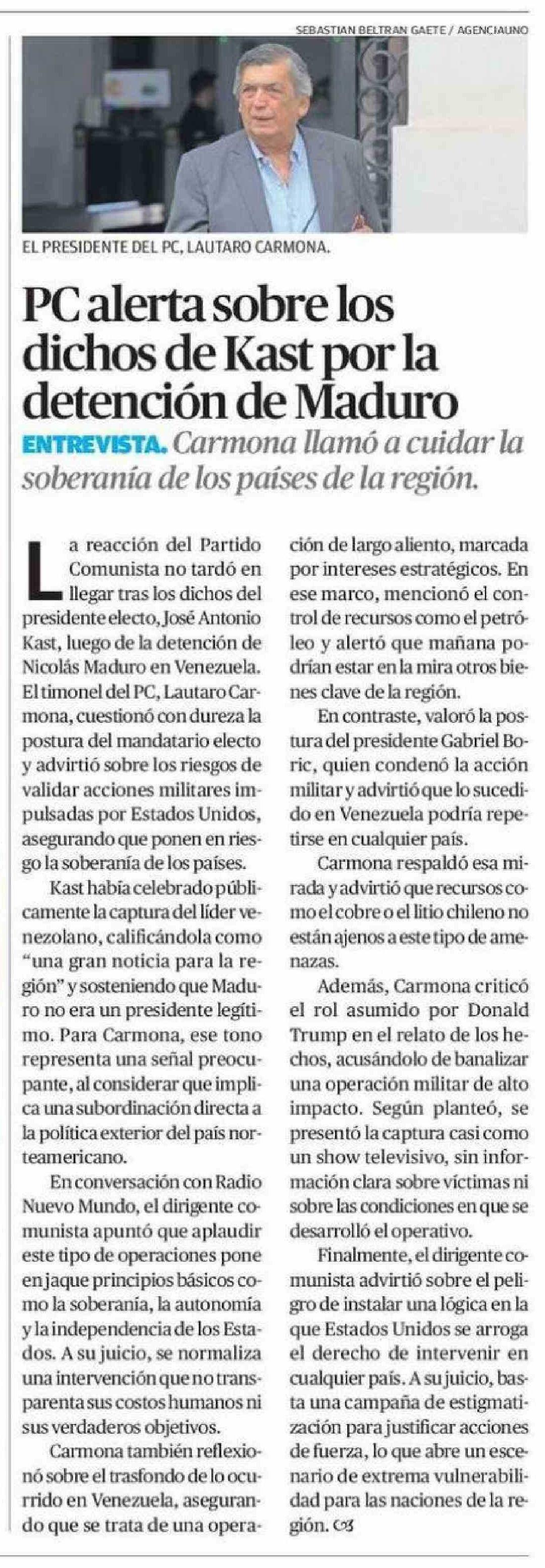 PC alerta sobre los dichos de Kast por la detención de Maduro 05-01-2026 El Mercurio de Antofagasta |