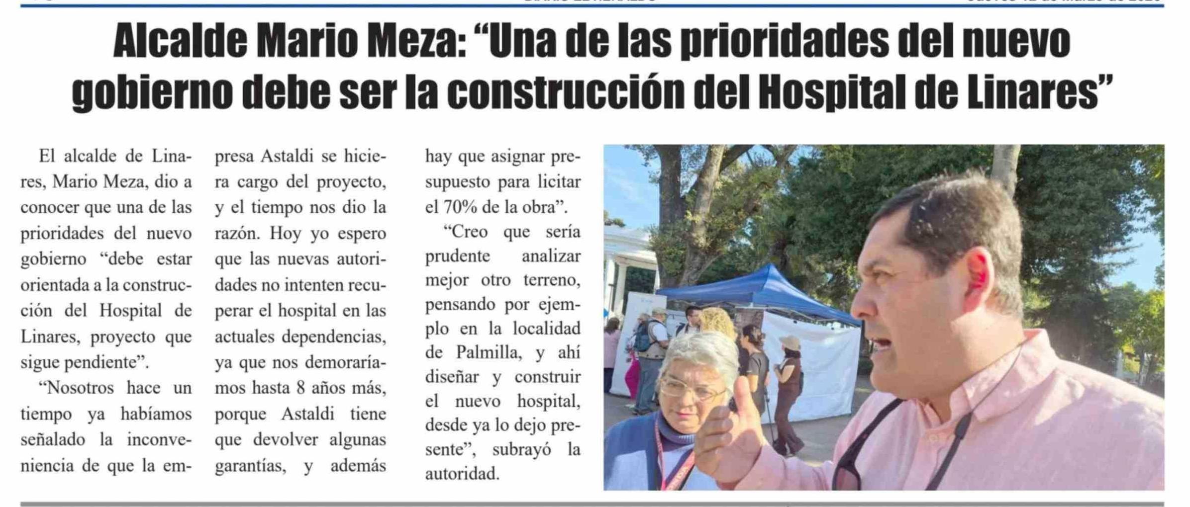 | Título: | Alcalde Mario Meza: "Una de las prioridades del nuevo gobierno debe ser la construcción del Hospital de Linares" |