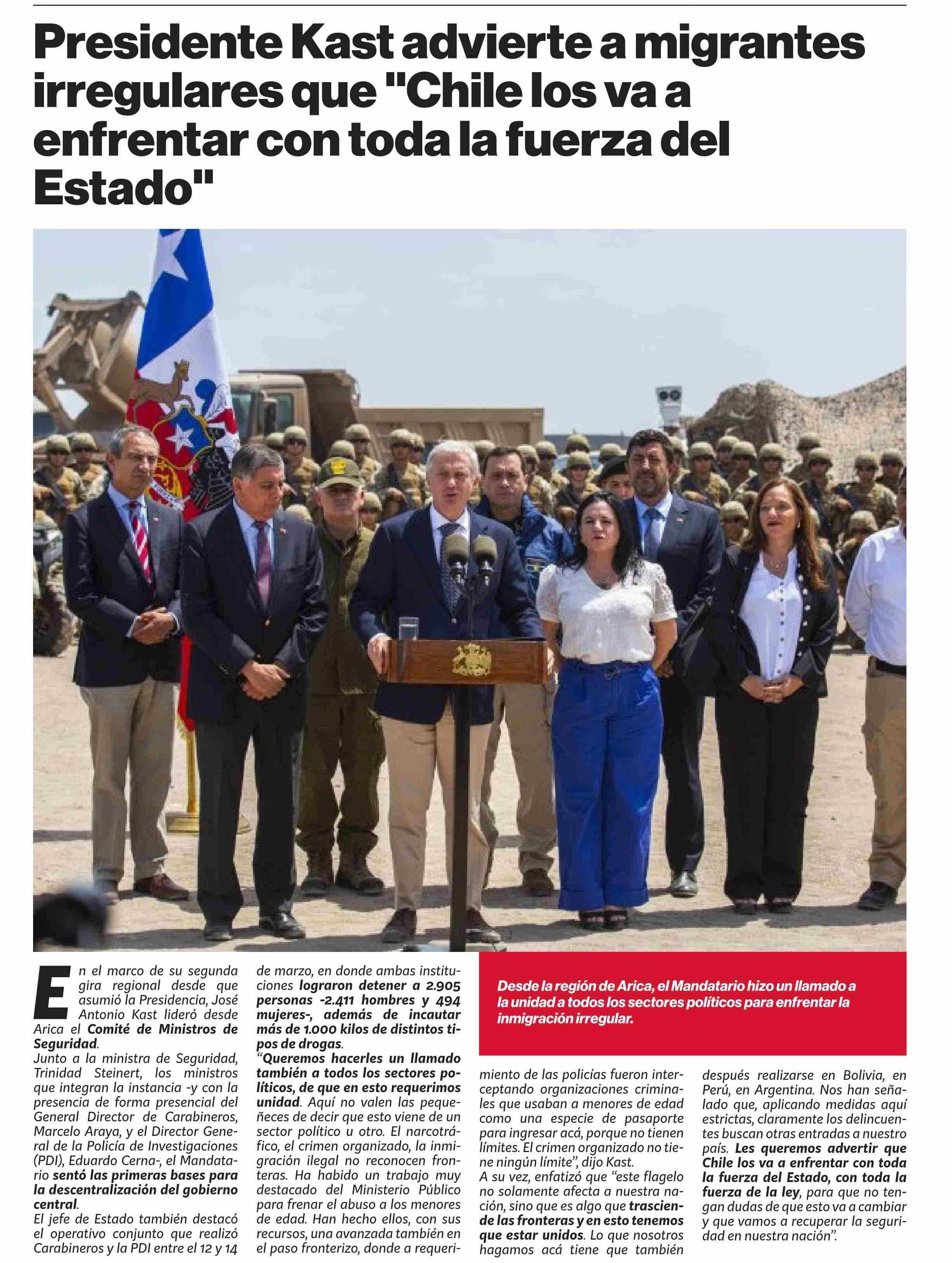 Presidente Kast advierte a migrantes irregulares que "Chile los va a enfrentar con toda la fuerza del Estado" 16-03-2026 Puranoticia.cl |
