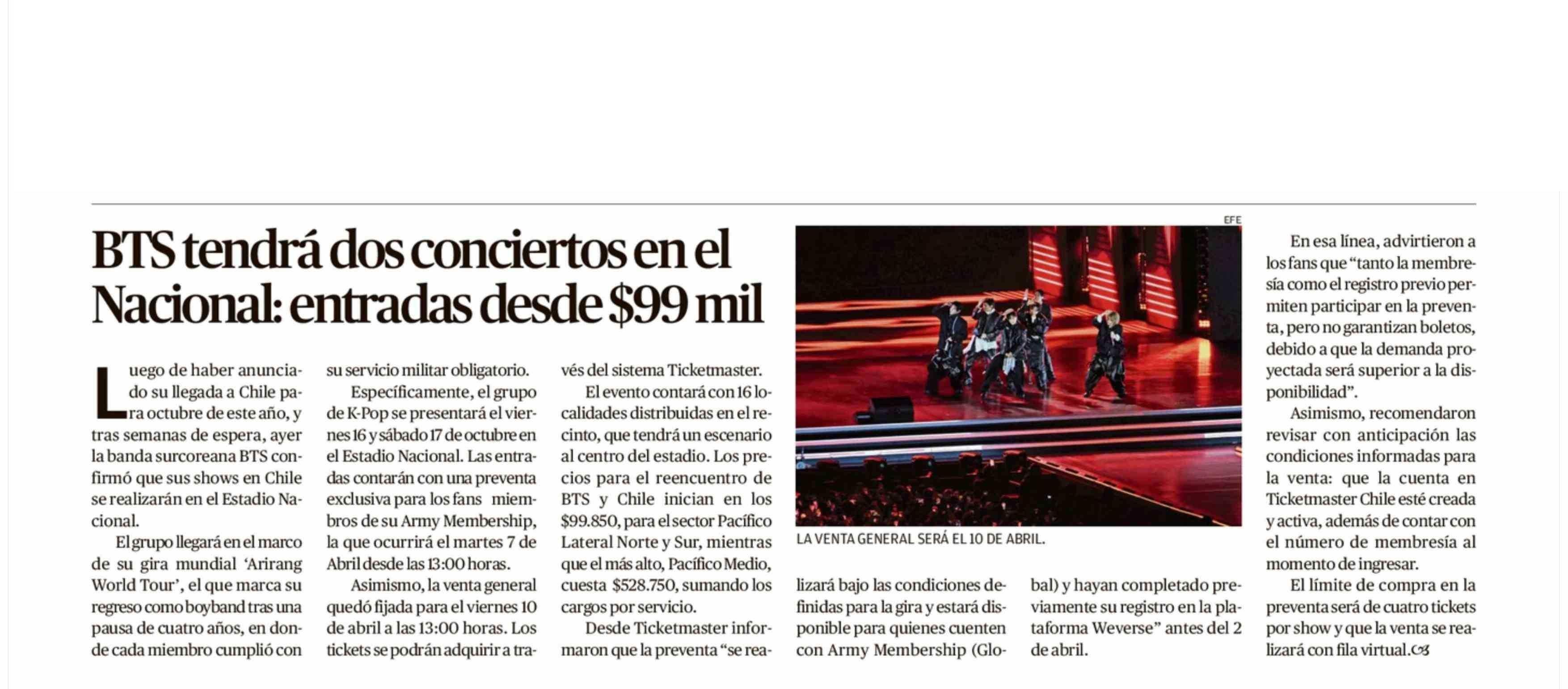 BTS tendrá dos conciertos en el Nacional: entradas desde $99 mil 28-03-2026 Crónica de Chillán |
