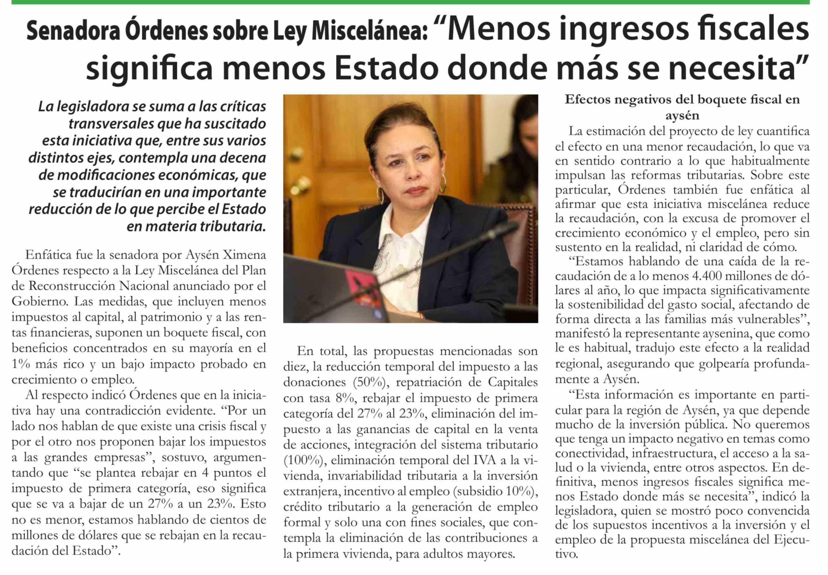 Senadora Órdenes sobre Ley Miscelánea: "Menos ingresos fiscales significa menos Estado donde más se necesita" 22-04-2026 El Divisadero |