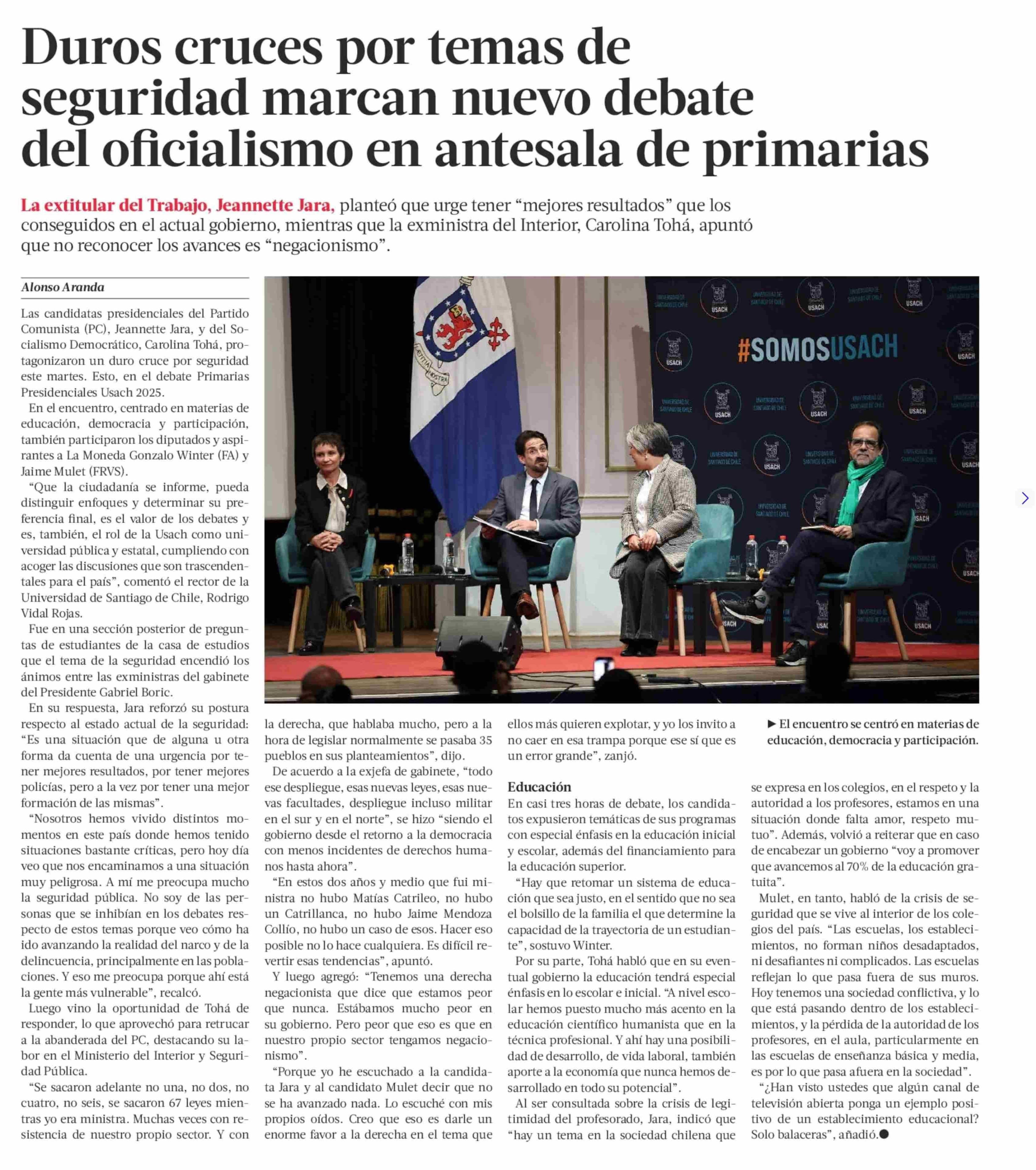 Duros cruces por temas de seguridad marcan nuevo debate del oficialismo en antesala de primarias 04-06-2025 La Tercera |