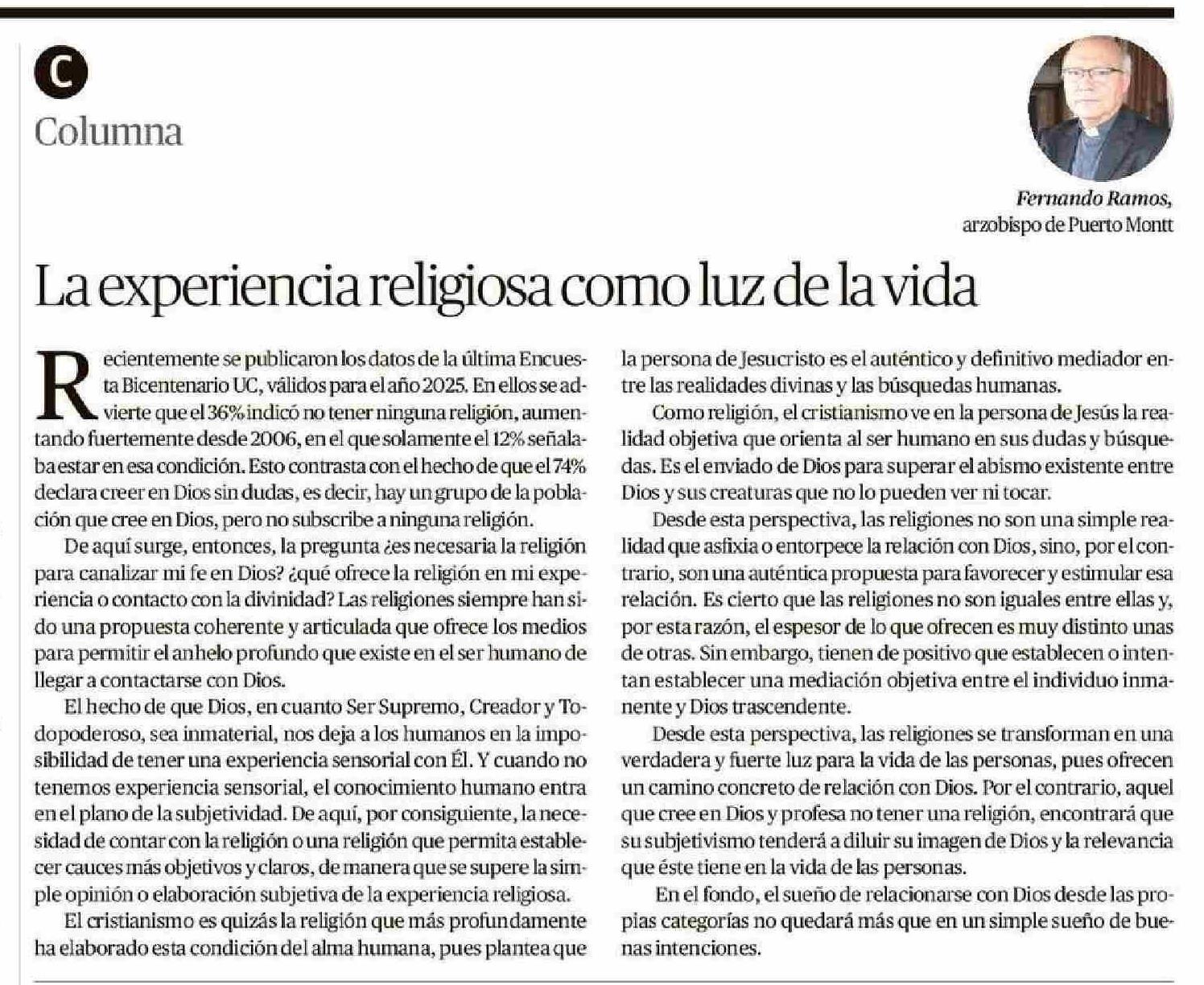 Título: Columnas de Opinión: La experiencia religiosa como luz de la vida
