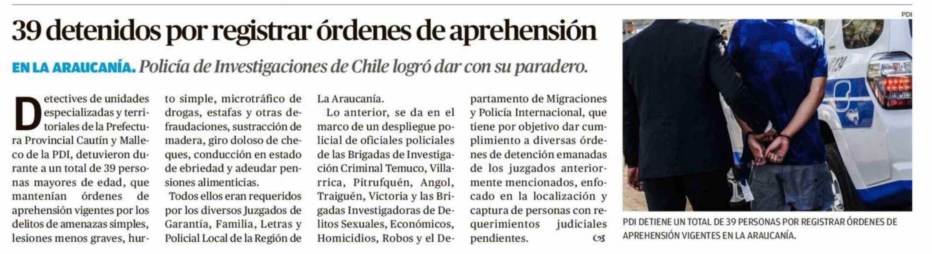 39 Detenidos por registrar órdenes de aprehensión 19-01-2026 El Austral de la Araucanía |