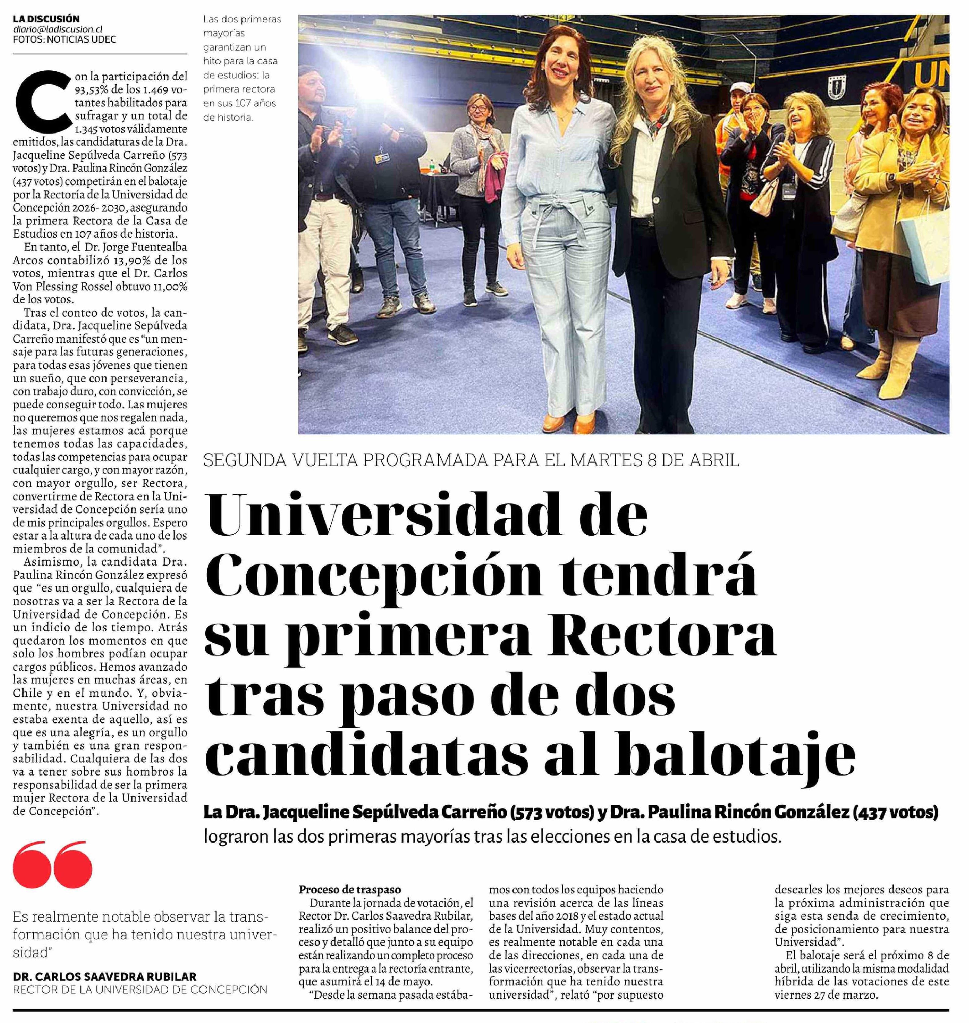 Título: Universidad de Concepción tendrá su primera Rectora tras paso de dos candidatas al balotaje
