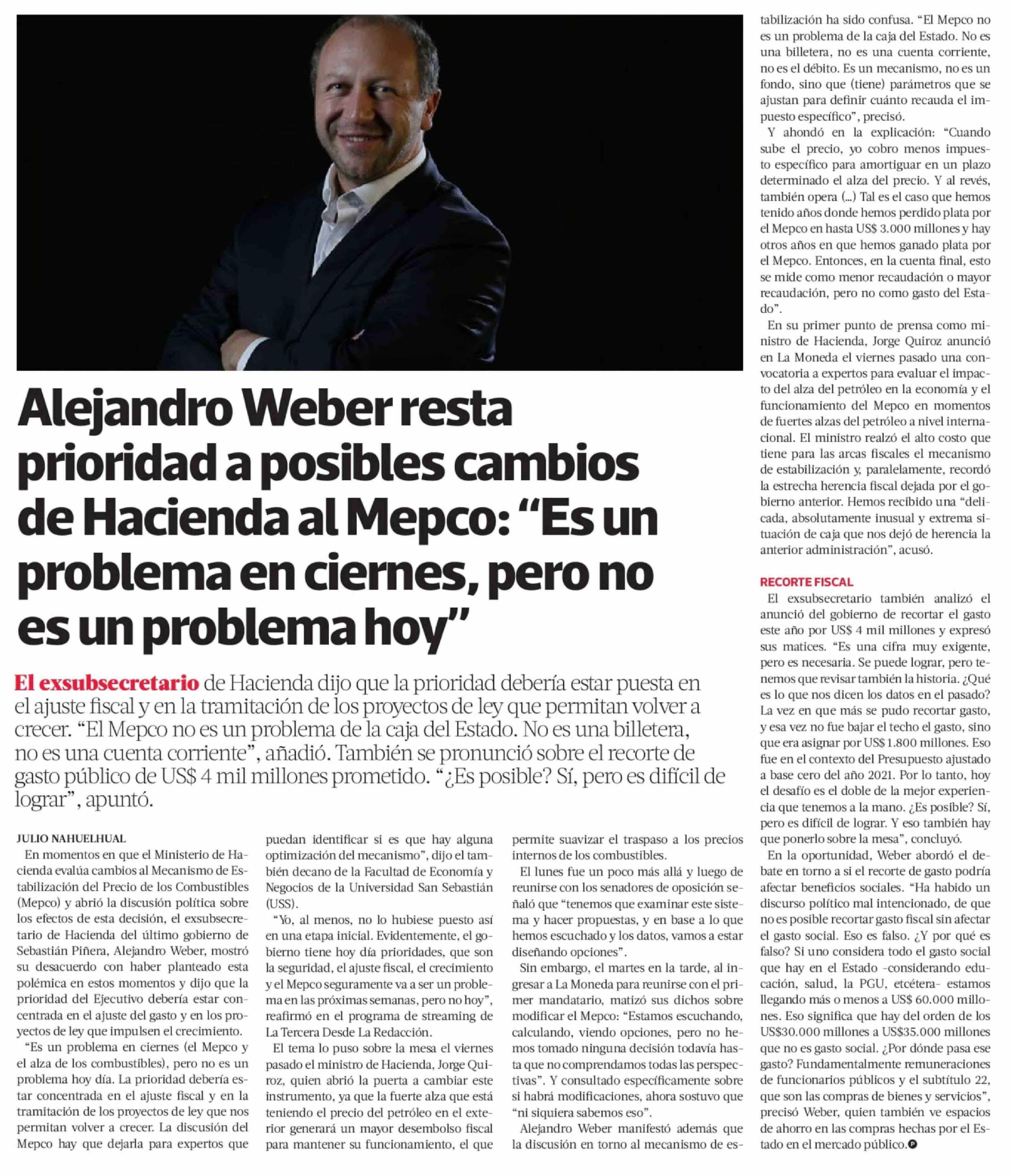 Alejandro Weber resta prioridad a posibles cambios de Hacienda al Mepco: "Es un problema en ciernes, pero no es un problema hoy" 19-03-2026 La Tercera |