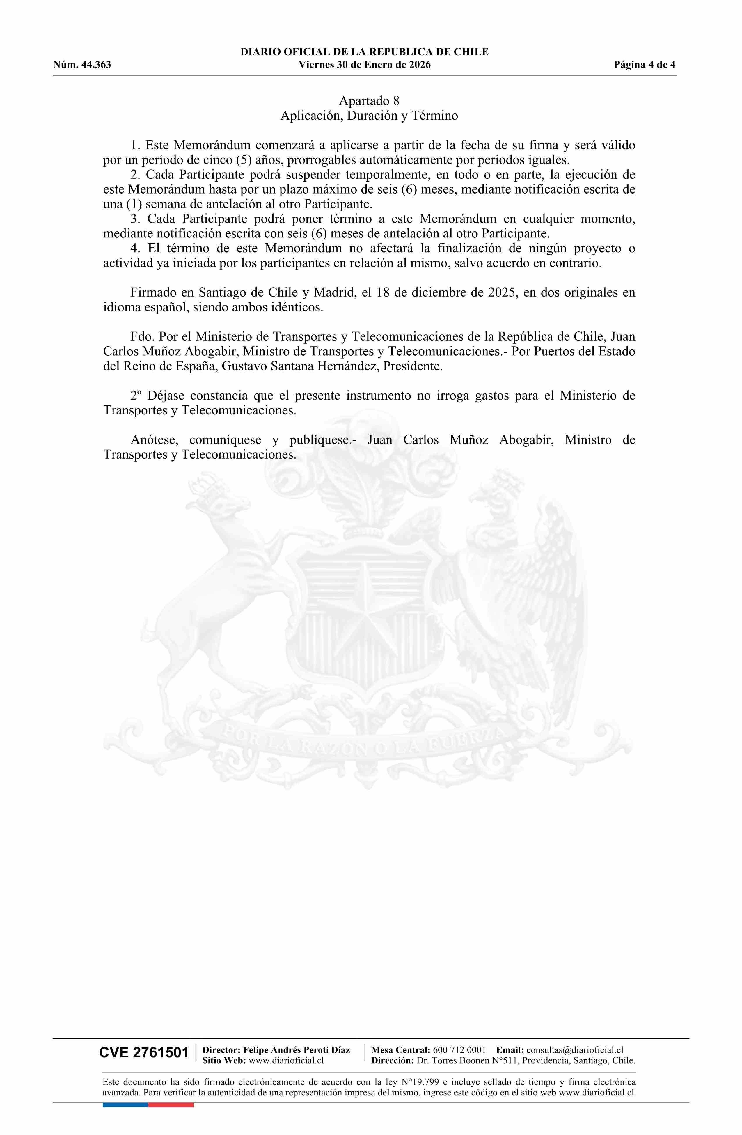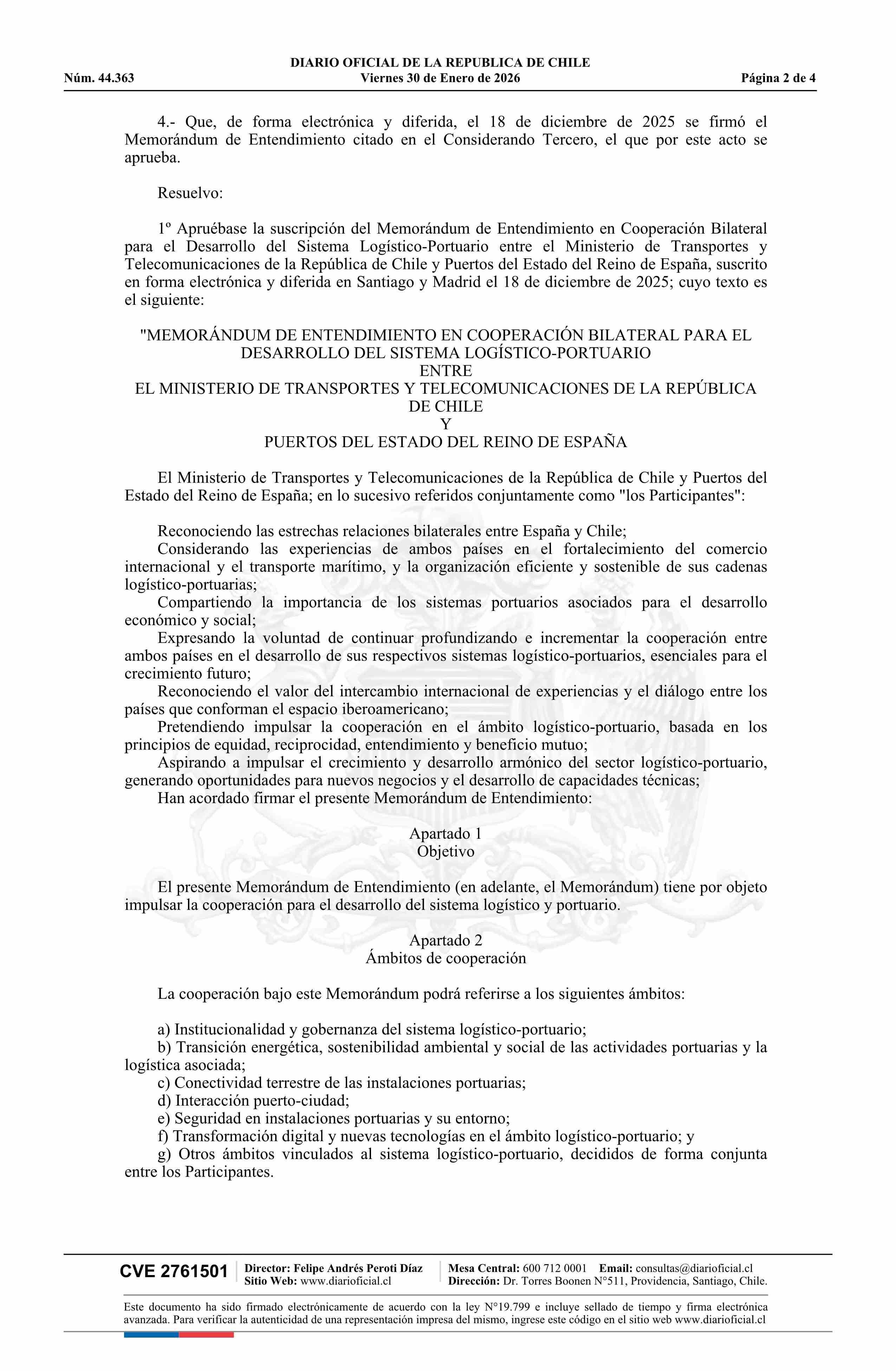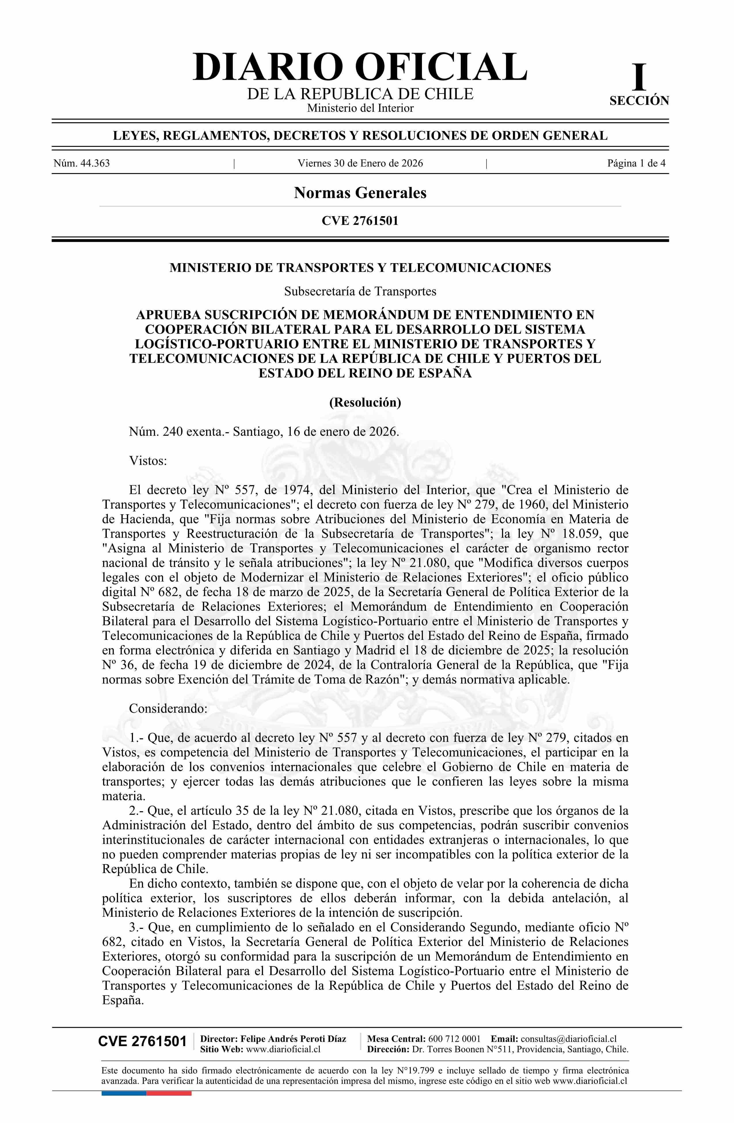 | Título: | Resolución exenta número 240, de 2026.- Aprueba suscripción de Memorándum de Entendimiento en Cooperación Bilateral para el Desarrollo del Sistema Logístico-Portuario entre el Ministerio de Transportes y Telecomunicaciones de la República de Chile y Puertos del Estado del Reino de España |