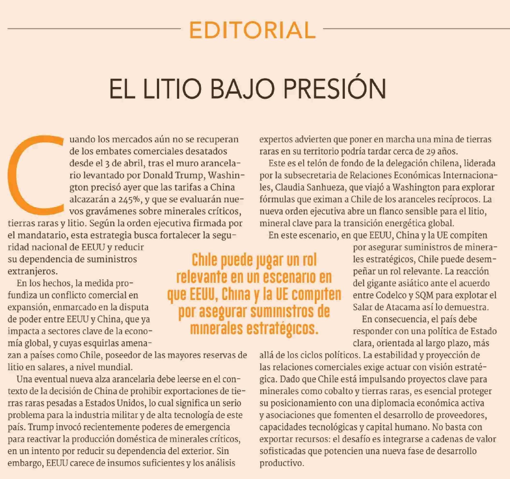 EDITORIAL: EL LITIO BAJO PRESIÓN 17-04-2025 Diario Financiero |