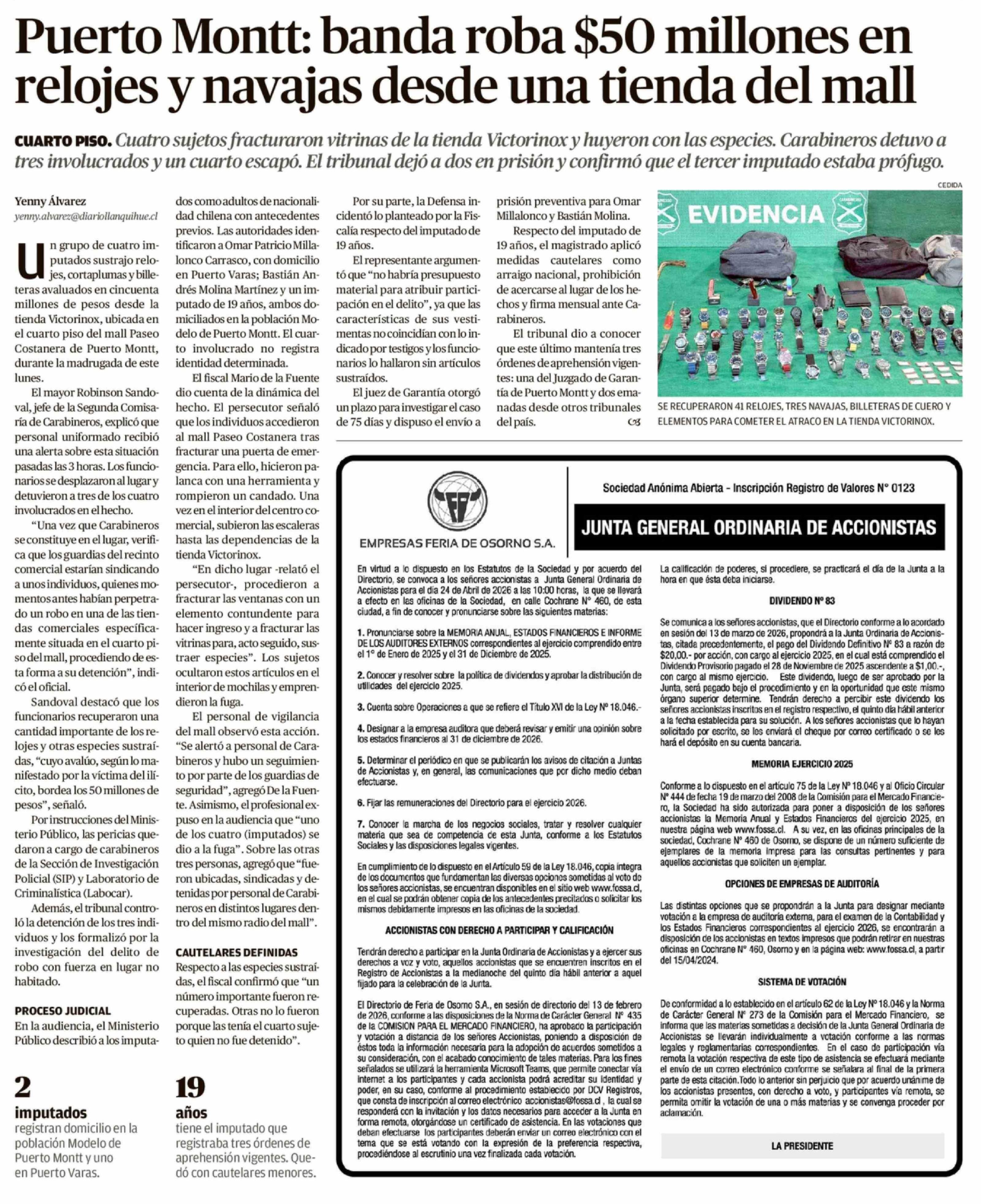 Puerto Montt: banda roba $50 millones en relojes y navajas desde una tienda del mall 07-04-2026 El Austral de Osorno |