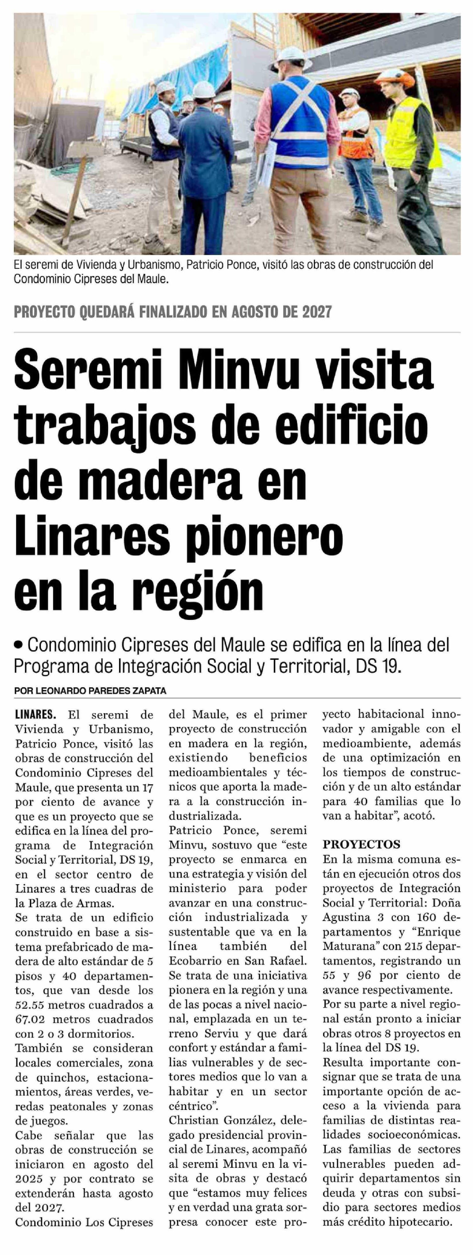 Seremi Minvu visita trabajos de edificio de madera en Linares pionero en la región 23-04-2026 La Prensa de Curicó |
