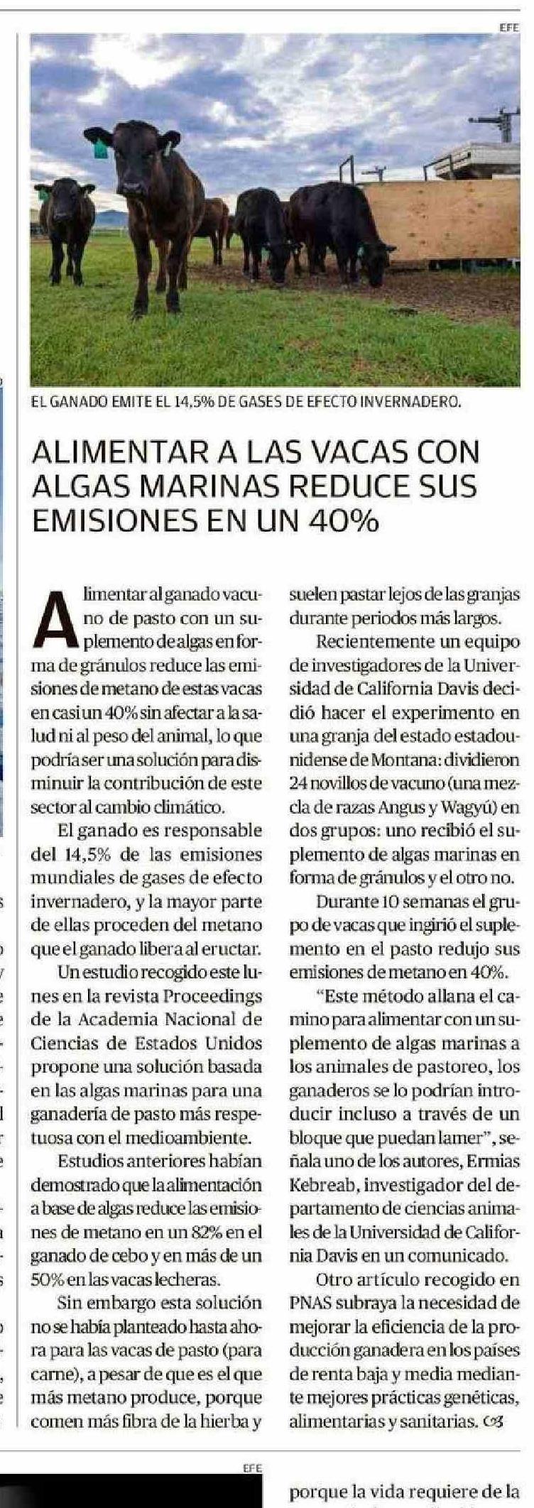 | Título: | ALIMENTAR A LAS VACAS CON ALGAS MARINAS REDUCE SUS EMISIONES EN UN 40% |