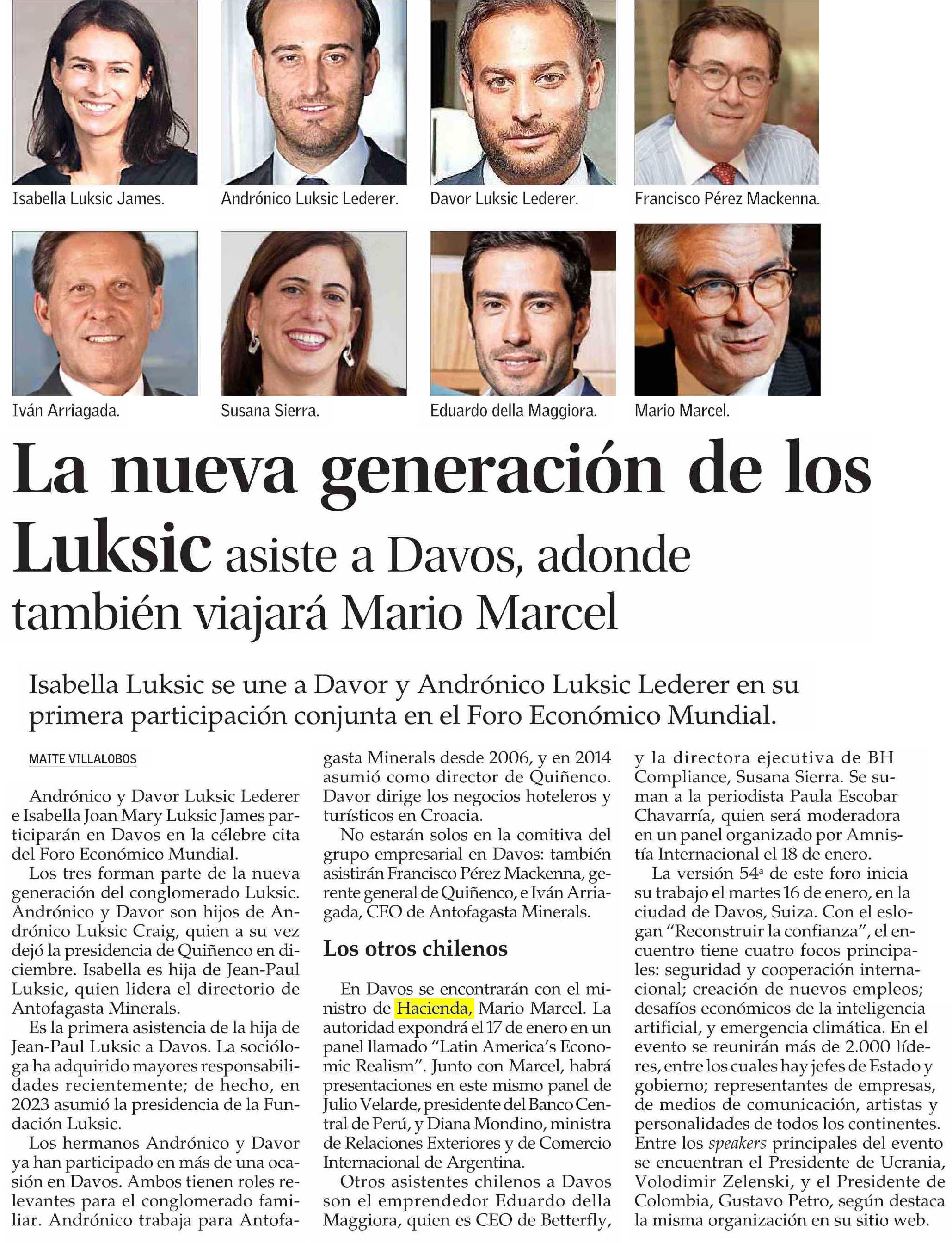 La nueva generación de los Luksic asiste a Davos, adonde también viajará Mario Marcel 11-01-2024 El Mercurio |