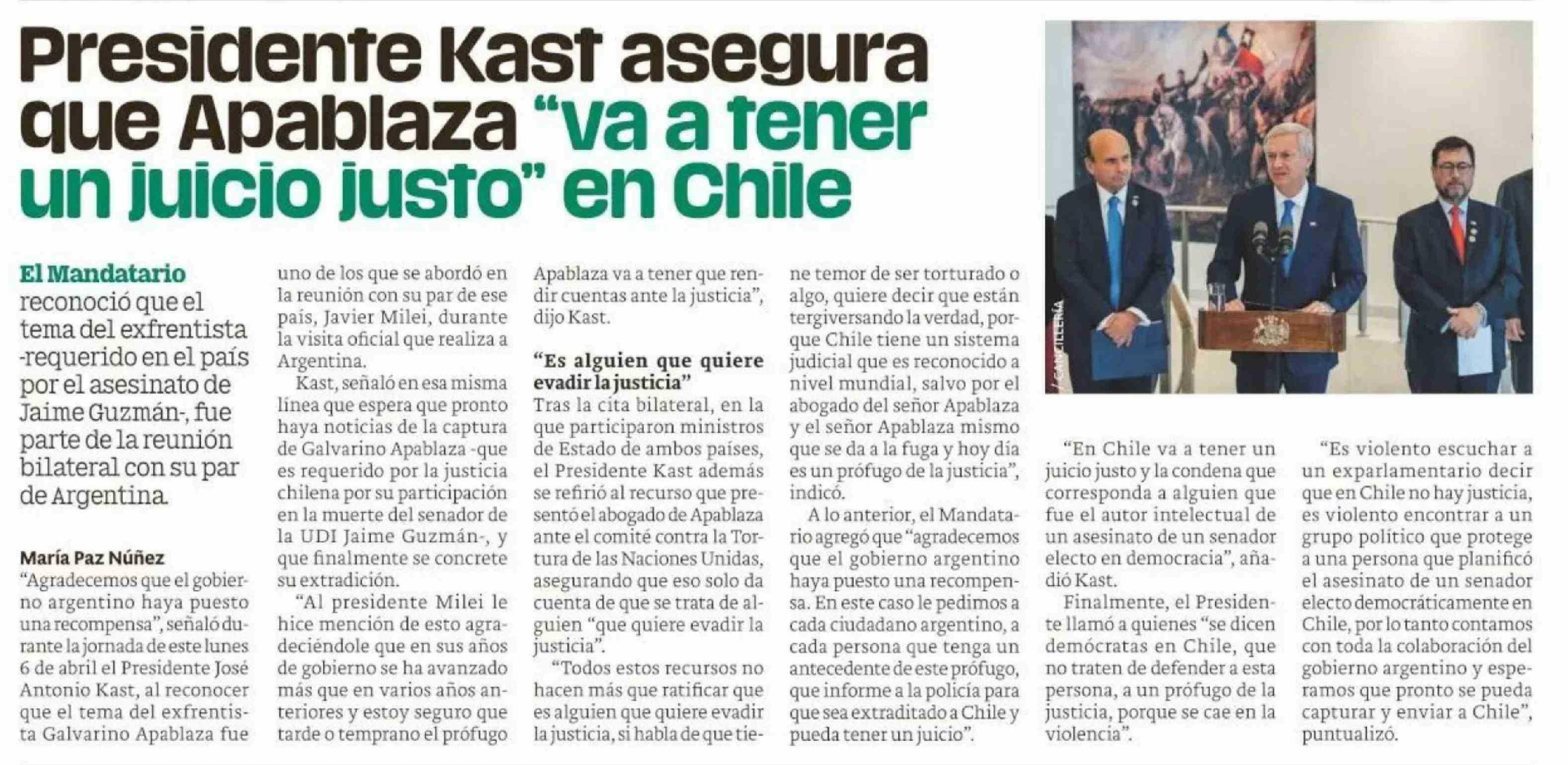 Título: Presidente Kast asegura que Apablaza "va a tener un juicio justo" en Chile