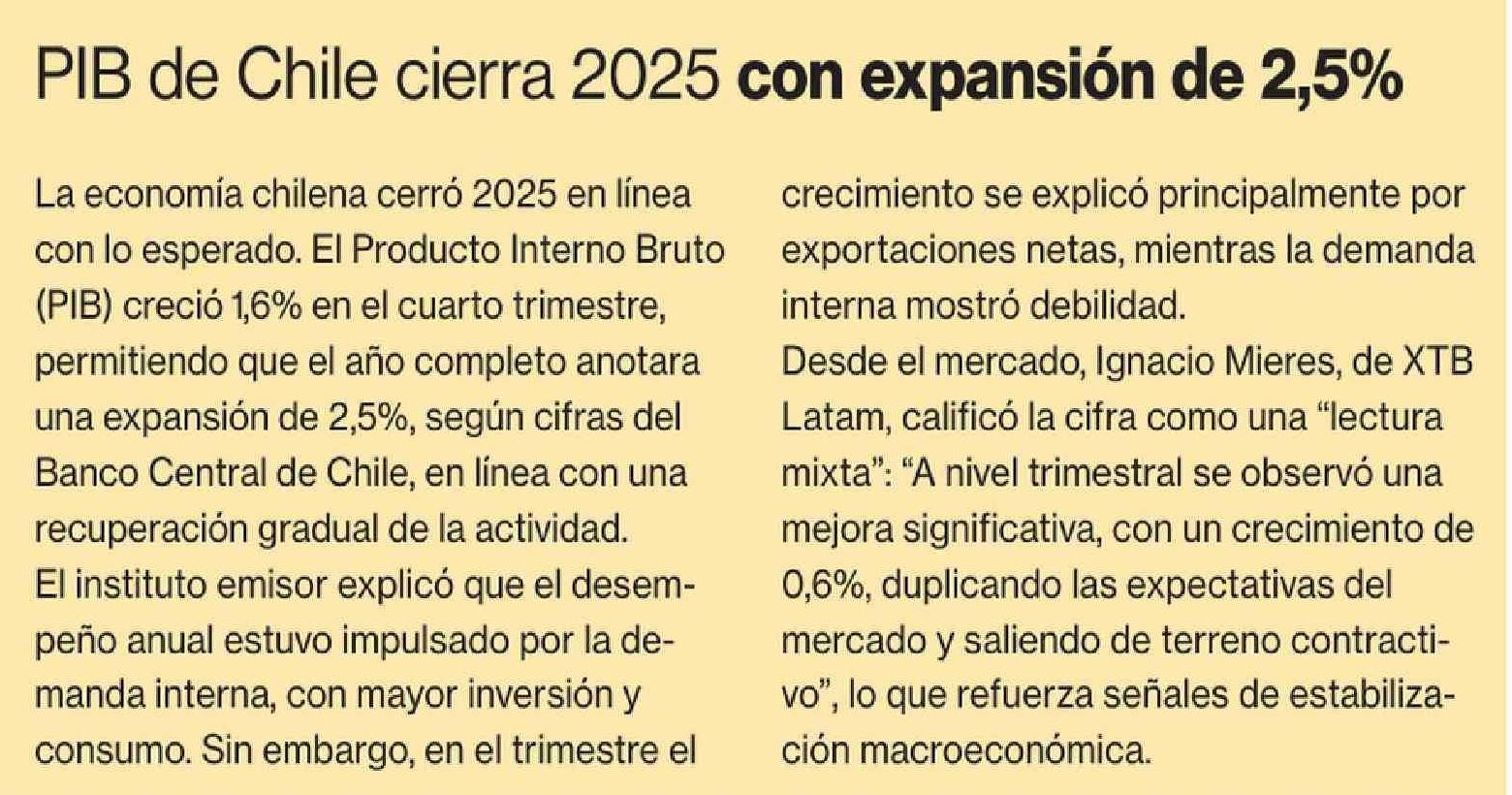Título: PIB de Chile cierra 2025 con expansión de 2,5%