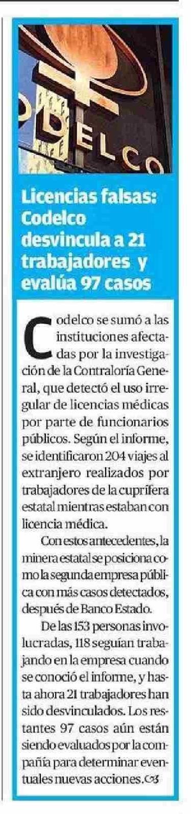 Licencias falsas: Codelco desvincula a 21 trabajadores y evalúa 97 casos 29-05-2025 El Mercurio de Antofagasta |