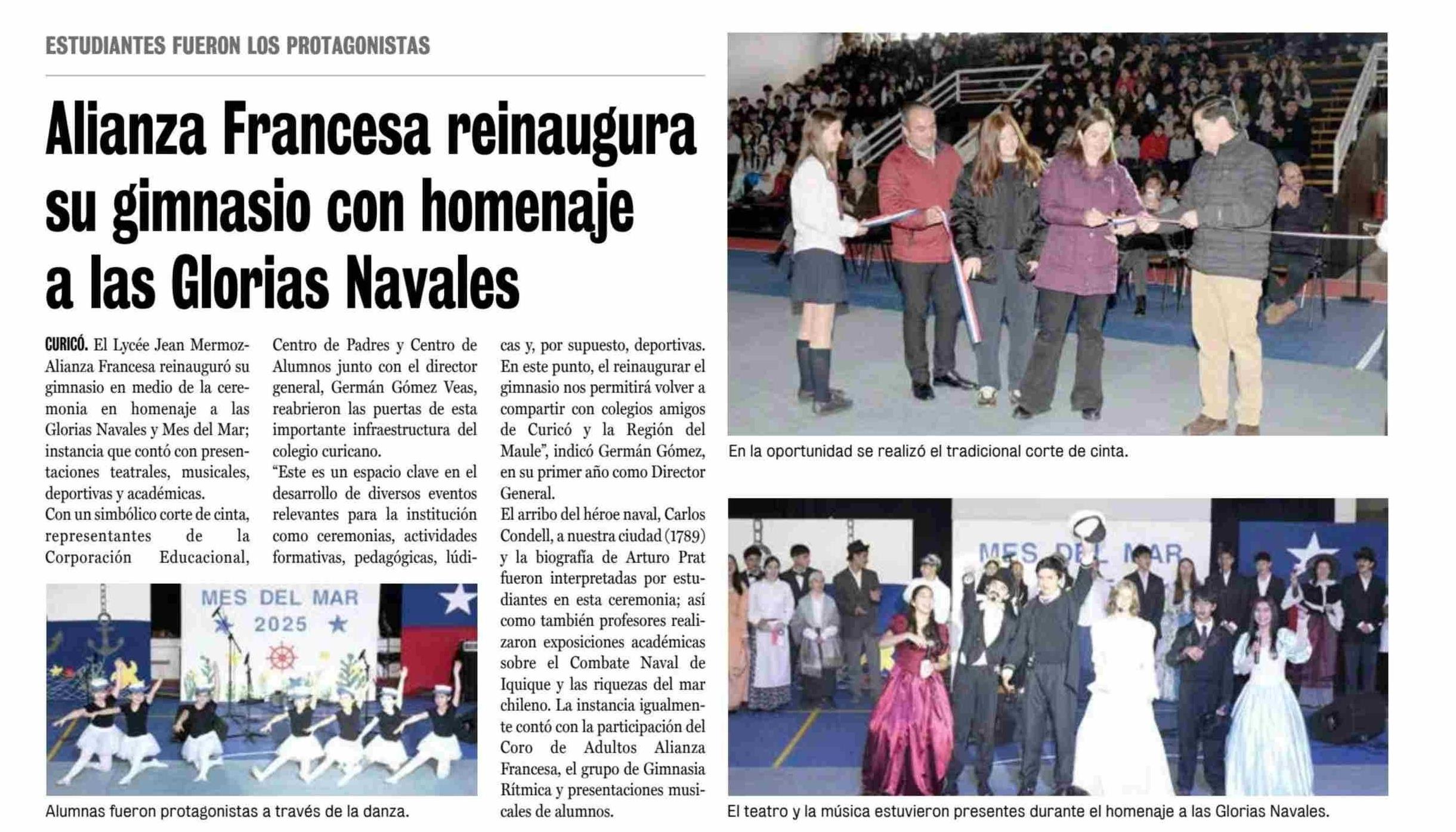 Alianza Francesa reinaugura su gimnasio con homenaje a las Glorias Navales 28-05-2025 La Prensa de Curicó |