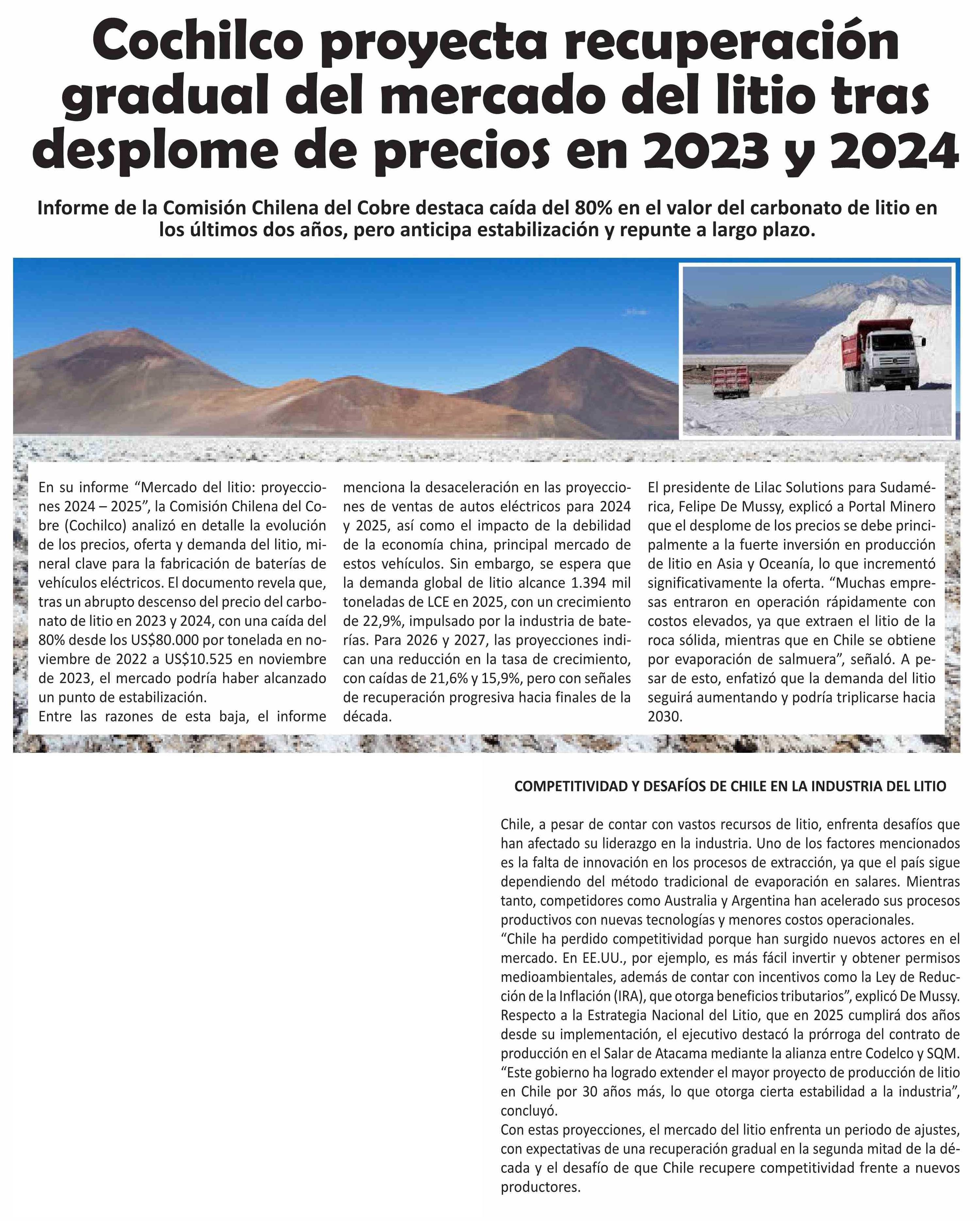 | Título: | Cochilco proyecta recuperación gradual del mercado del litio tras desplome de precios en 2023 y 2024 |