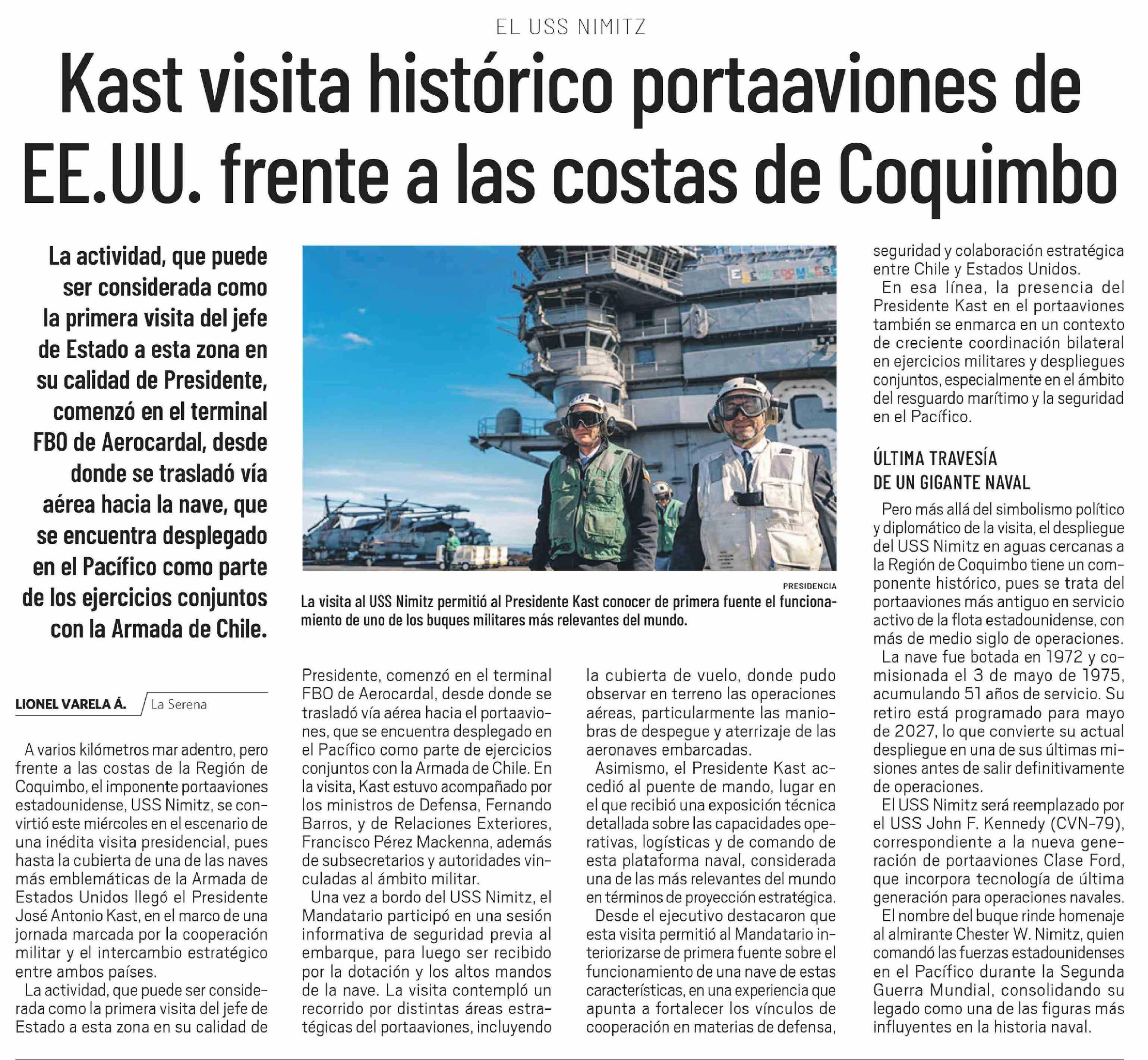 Kast visita histórico portaaviones de EE.UU. frente a las costas de Coquimbo 17-04-2026 El Día |