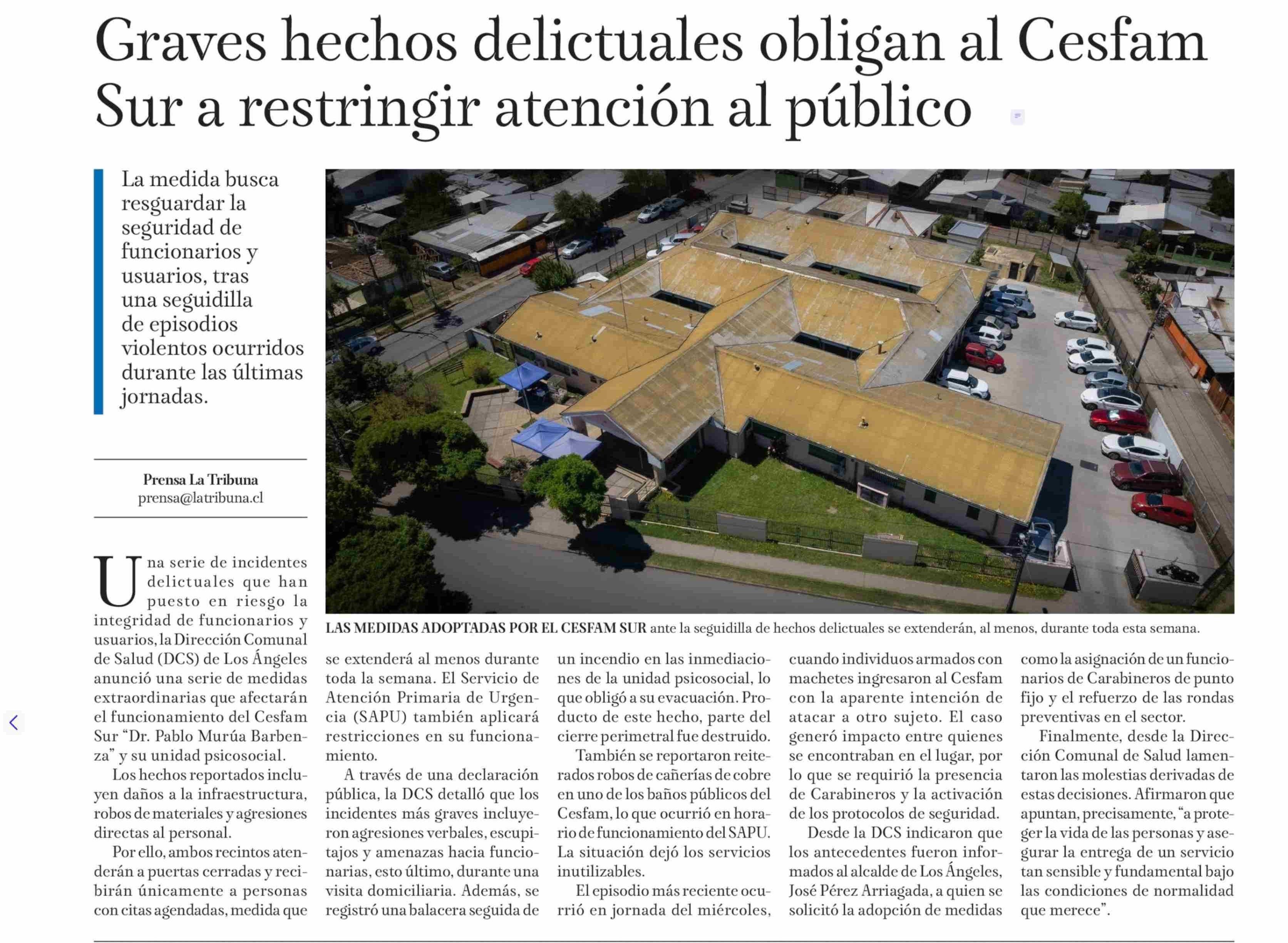 Graves hechos delictuales obligan al Cesfam Sur a restringir atención al público 29-05-2025 La Tribuna |