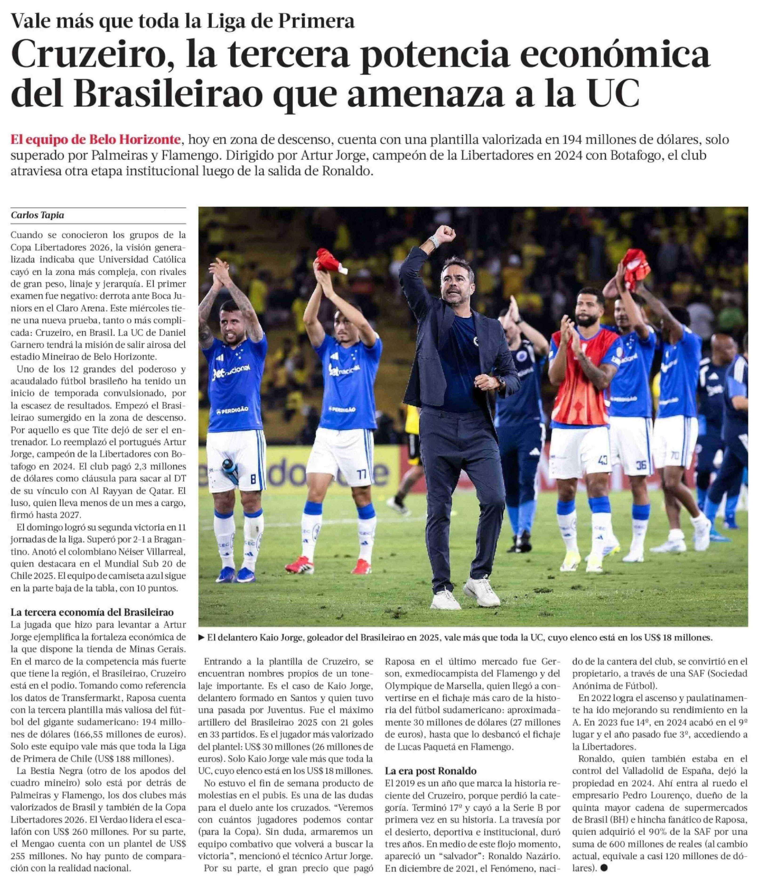 Título: Cruzeiro, la tercera potencia económica del Brasileirao que amenaza a la UC