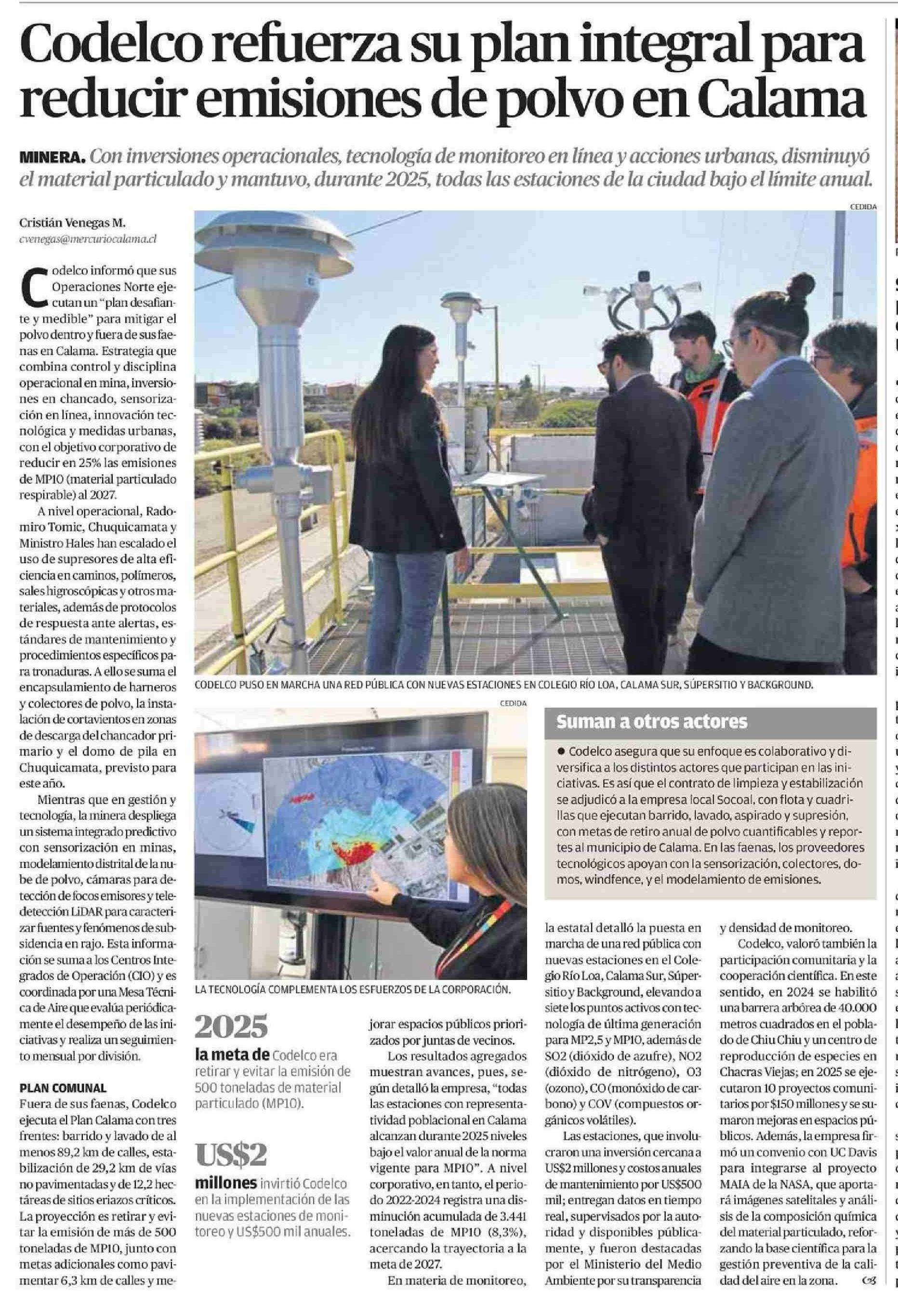 Título: Codelco refuerza su plan integral para reducir emisiones de polvo en Calama