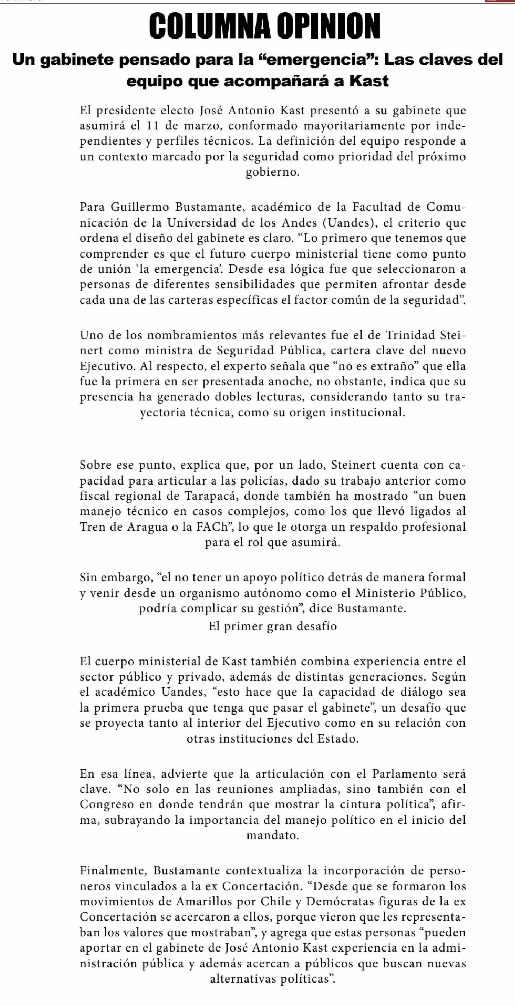 | Título: | Columnas de Opinión: Un gabinete pensado para la "emergencia": Las claves del equipo que acompañara a Kast |