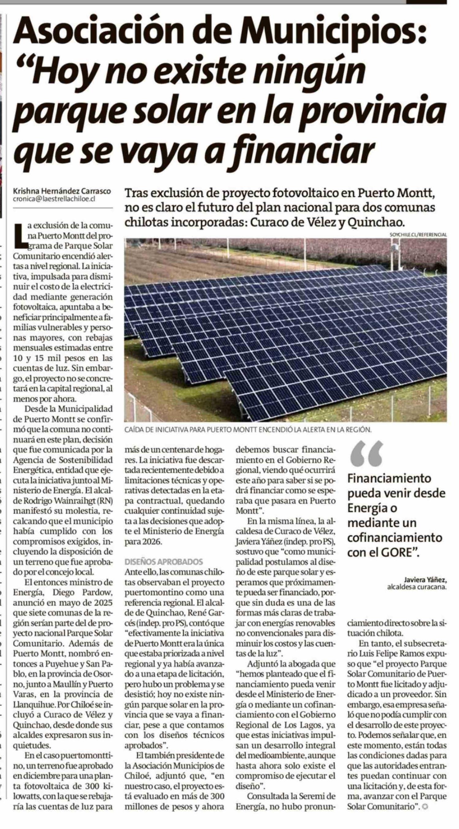 Asociación de Municipios: "Hoy no existe ningún parque solar en la provincia que se vaya a financiar 05-03-2026 La Estrella de Chiloé |