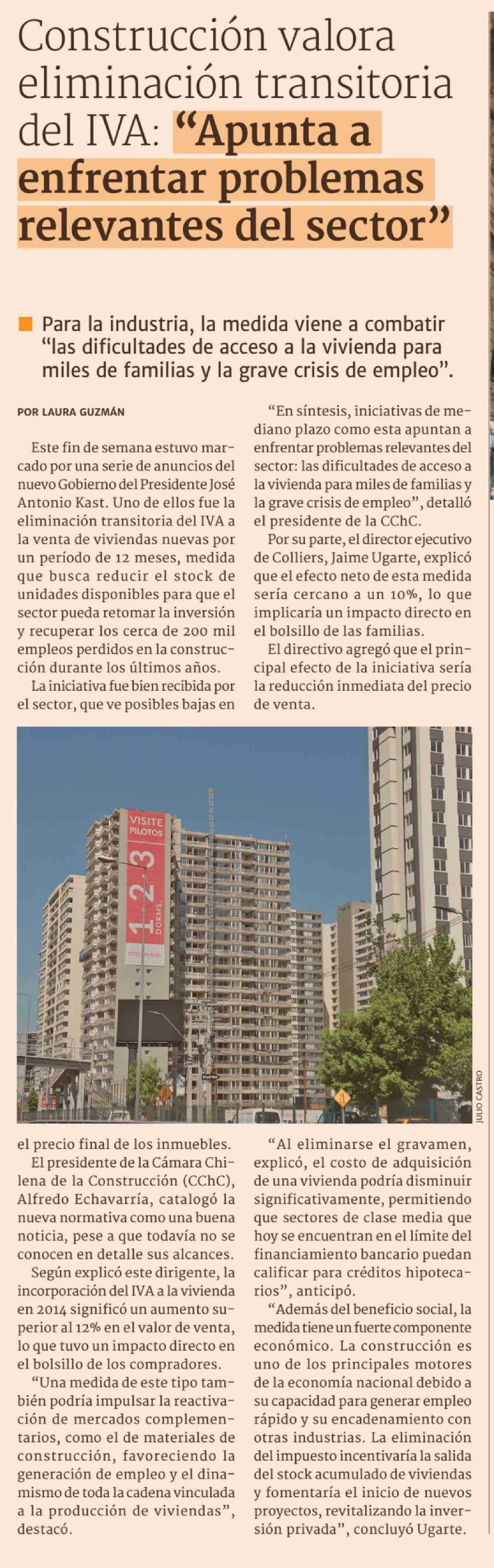 Título: Construcción valora eliminación transitoria del IVA: "Apunta a enfrentar problemas relevantes del sector"