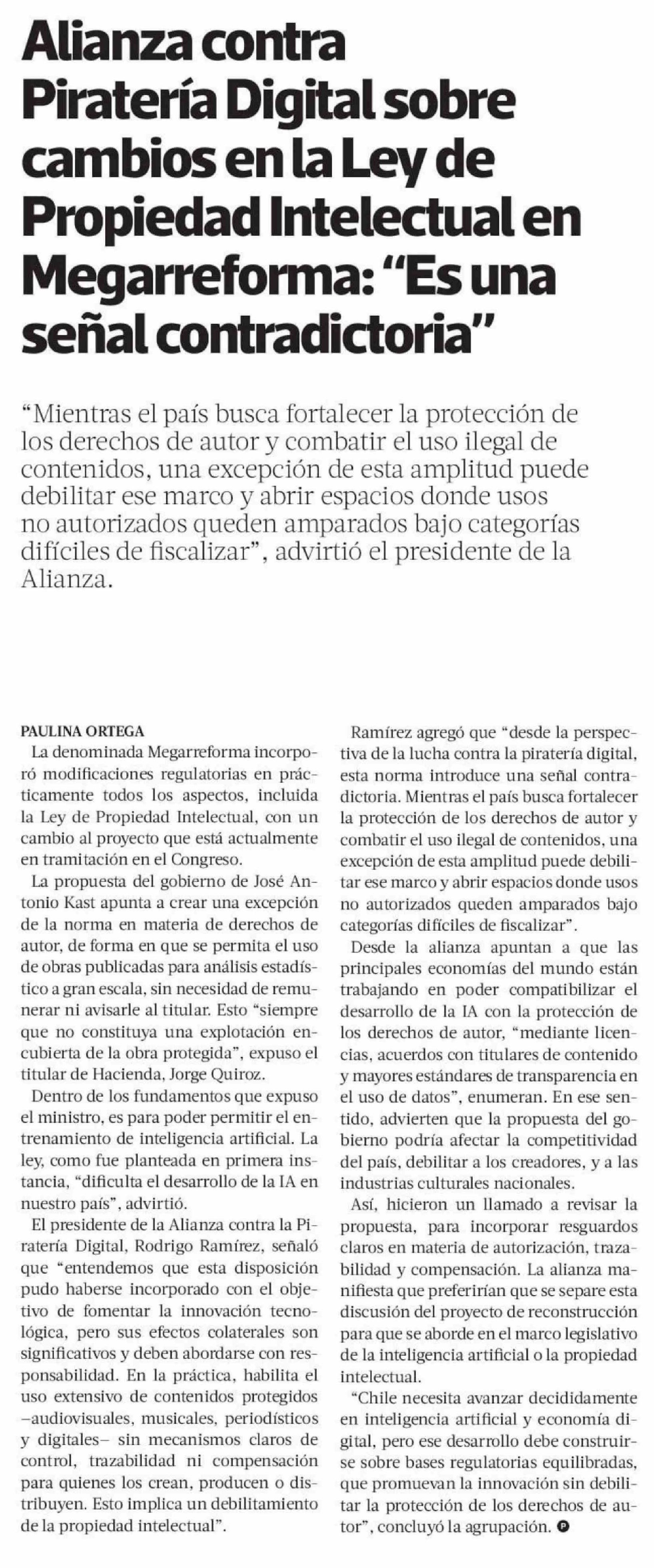 Alianza contra Piratería Digital sobre cambios en la Ley de Propiedad Intelectual en Megarreforma: "Es una señal contradictoria" 27-04-2026 La Tercera |