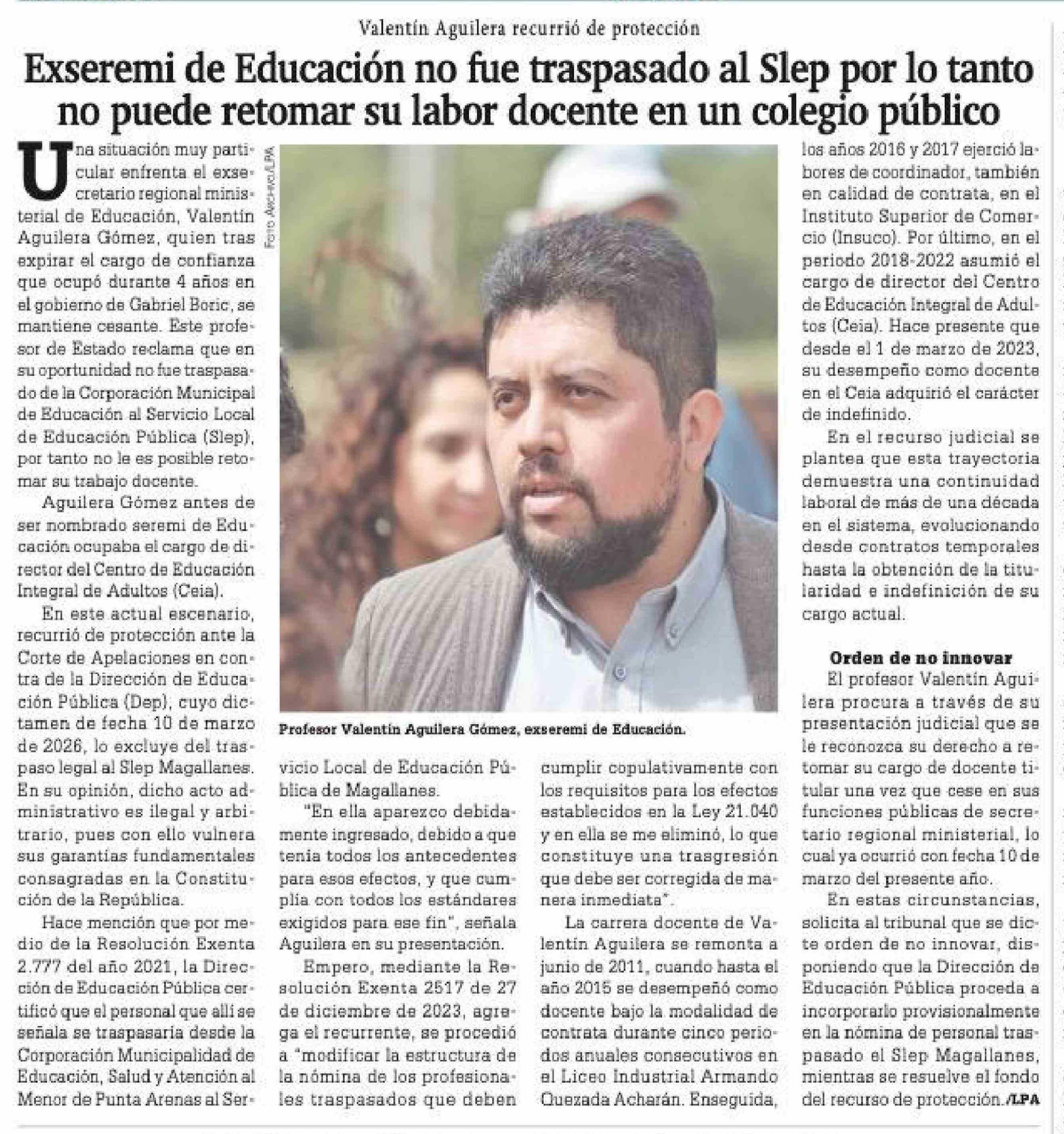 Exseremi de Educación no fue traspasado al Slep por lo tanto no puede retomar su labor docente en un colegio público 13-04-2026 La Prensa Austral |