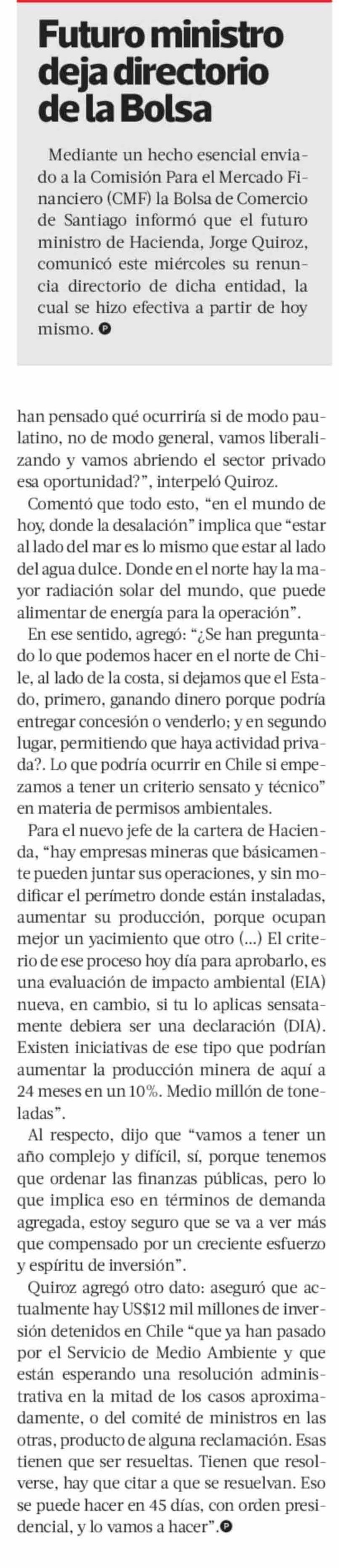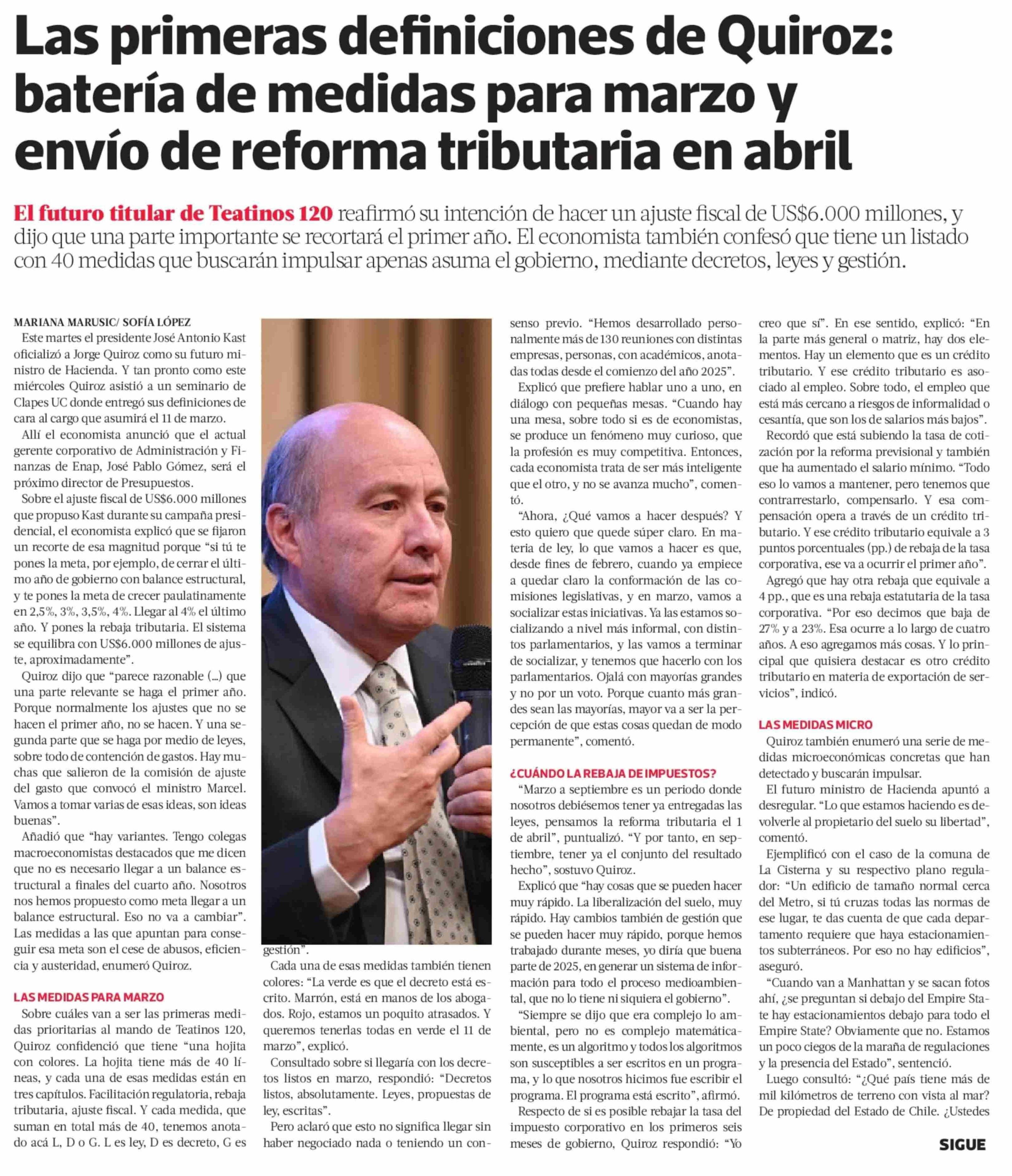 Las primeras definiciones de Quiroz: batería de medidas para marzo y envío de reforma tributaria en abril 22-01-2026 La Tercera |