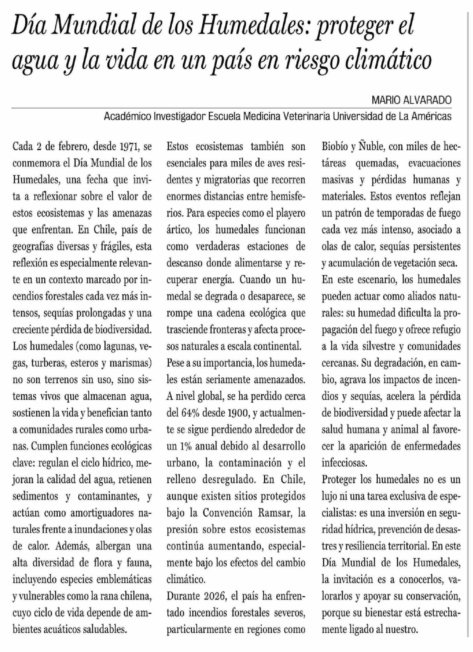 Título: Columnas de Opinión: Día Mundial de los Humedales: proteger el agua y la vida en un país en riesgo climático
