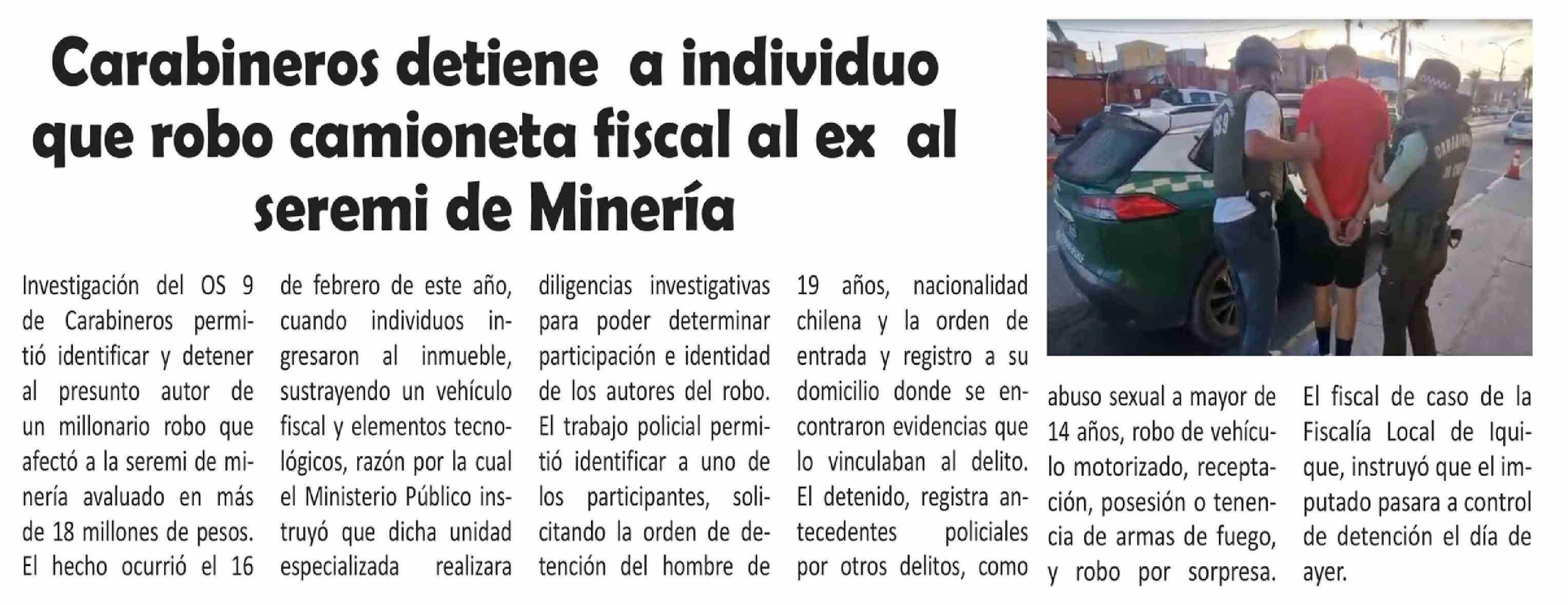 | Título: | Carabineros detiene a individuo que robo camioneta fiscal al ex al seremi de Minería |