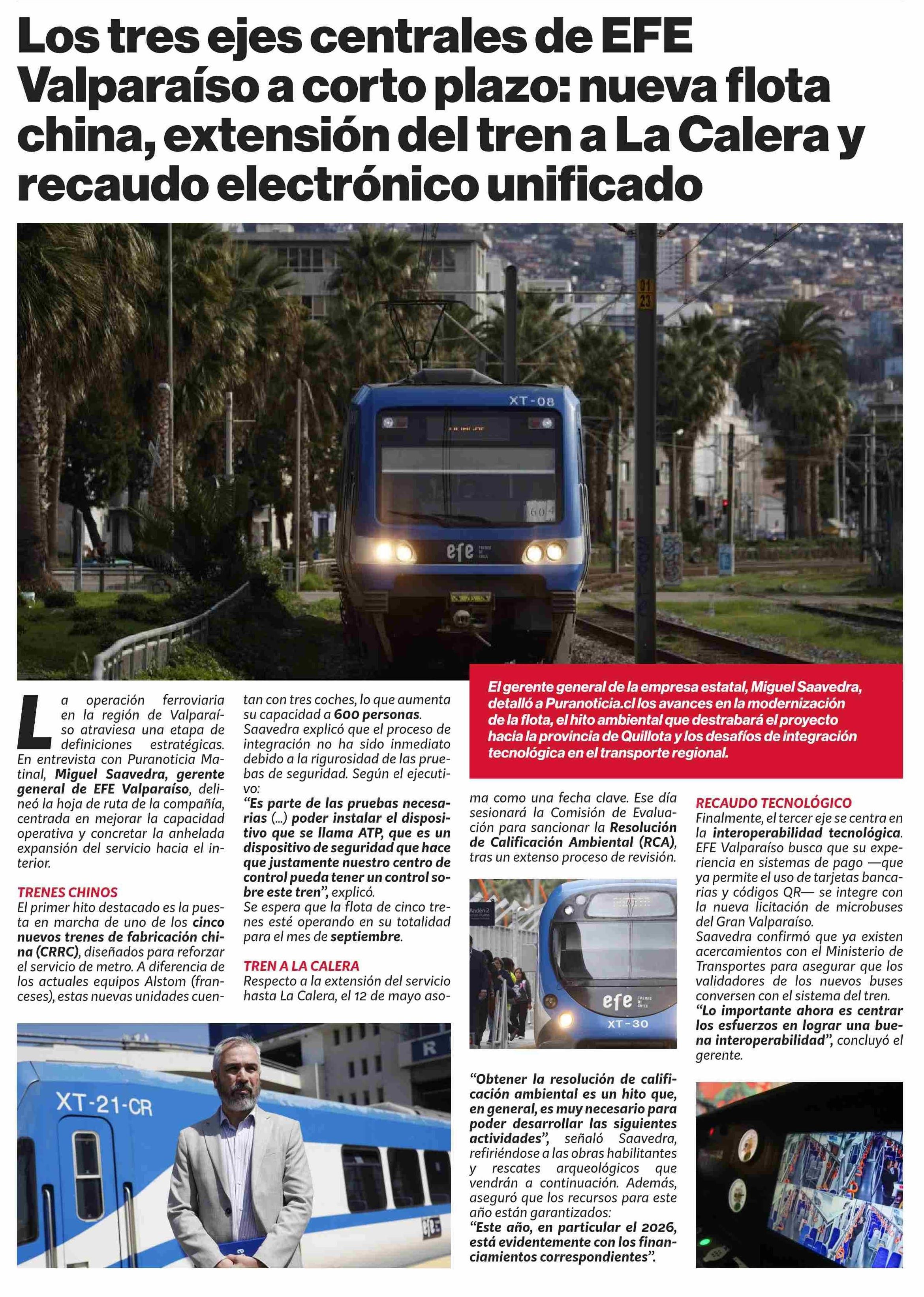Los tres ejes centrales de EFE Valparaíso a corto plazo: nueva flota china, extensión del tren a La Calera y recaudo electrónico unificado 24-04-2026 Puranoticia.cl |