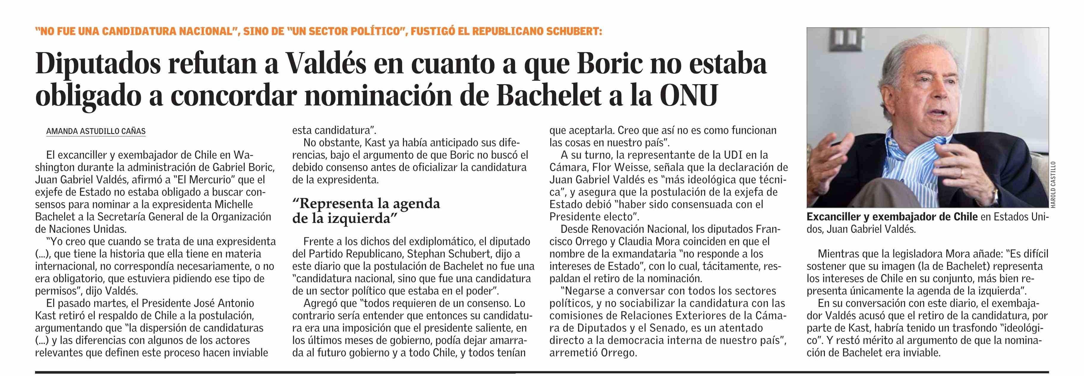 Título: Diputados refutan a Valdés en cuanto a que Boric no estaba obligado a concordar nominación de Bachelet a la ONU