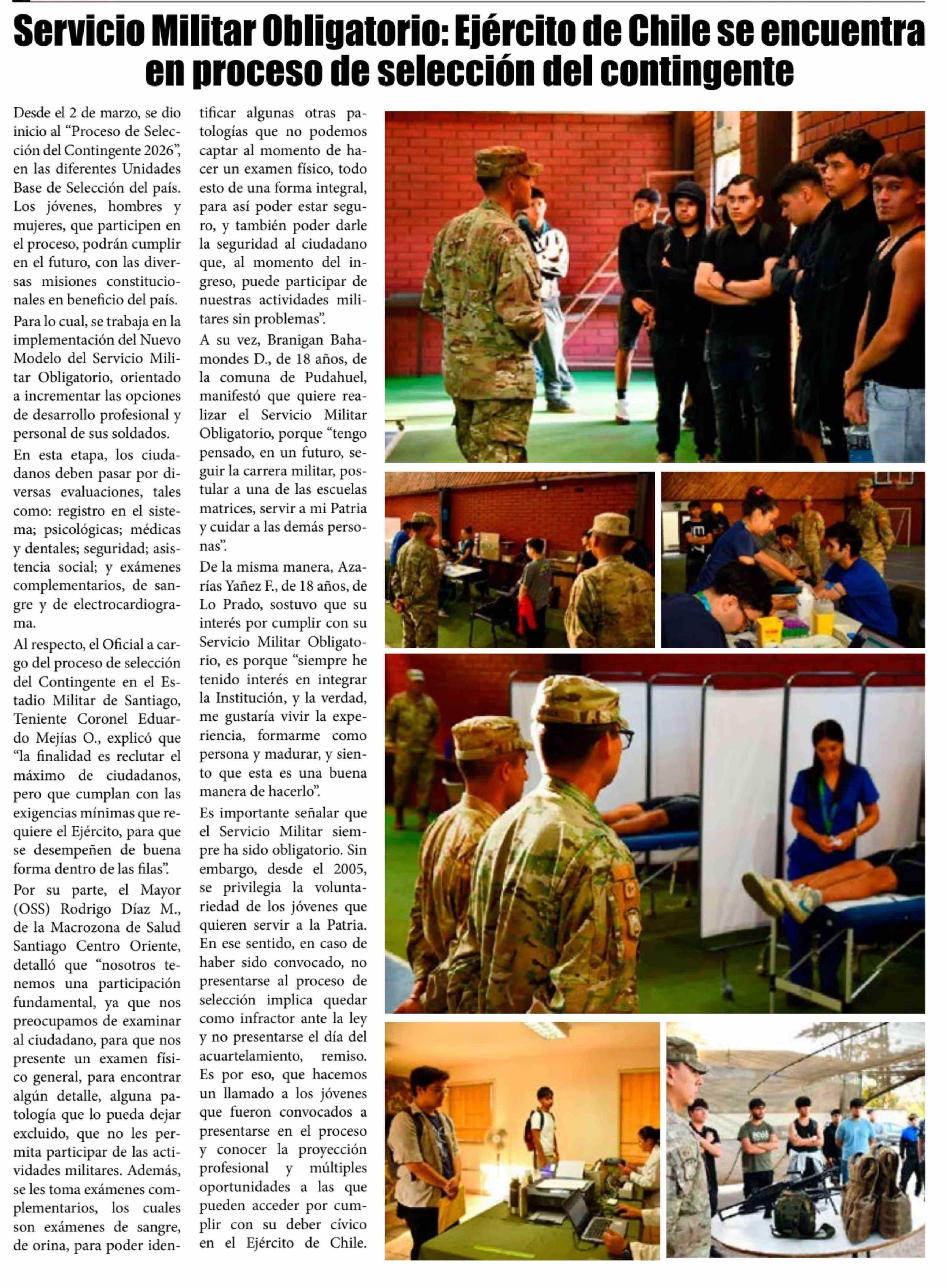 Servicio Militar Obligatorio: Ejército de Chile se encuentra en proceso de selección del contingente 13-03-2026 El Lector |