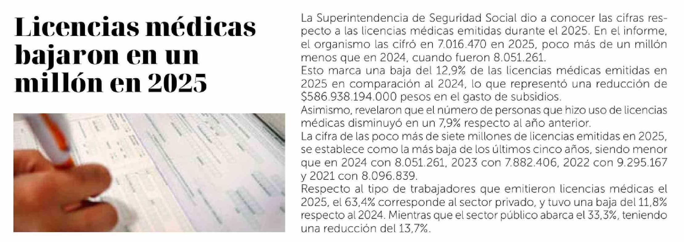 | Título: | Licencias médicas bajaron en un millón en 2025 |