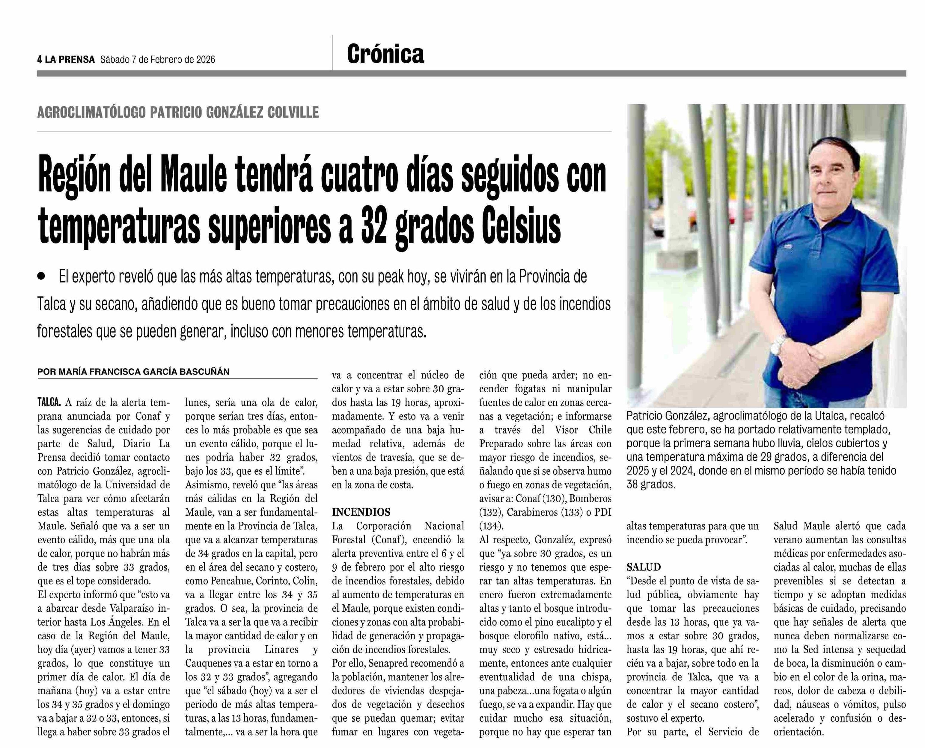 Región del Maule tendrá cuatro días seguidos con temperaturas superiores a 32 grados Celsius 07-02-2026 La Prensa de Curicó |