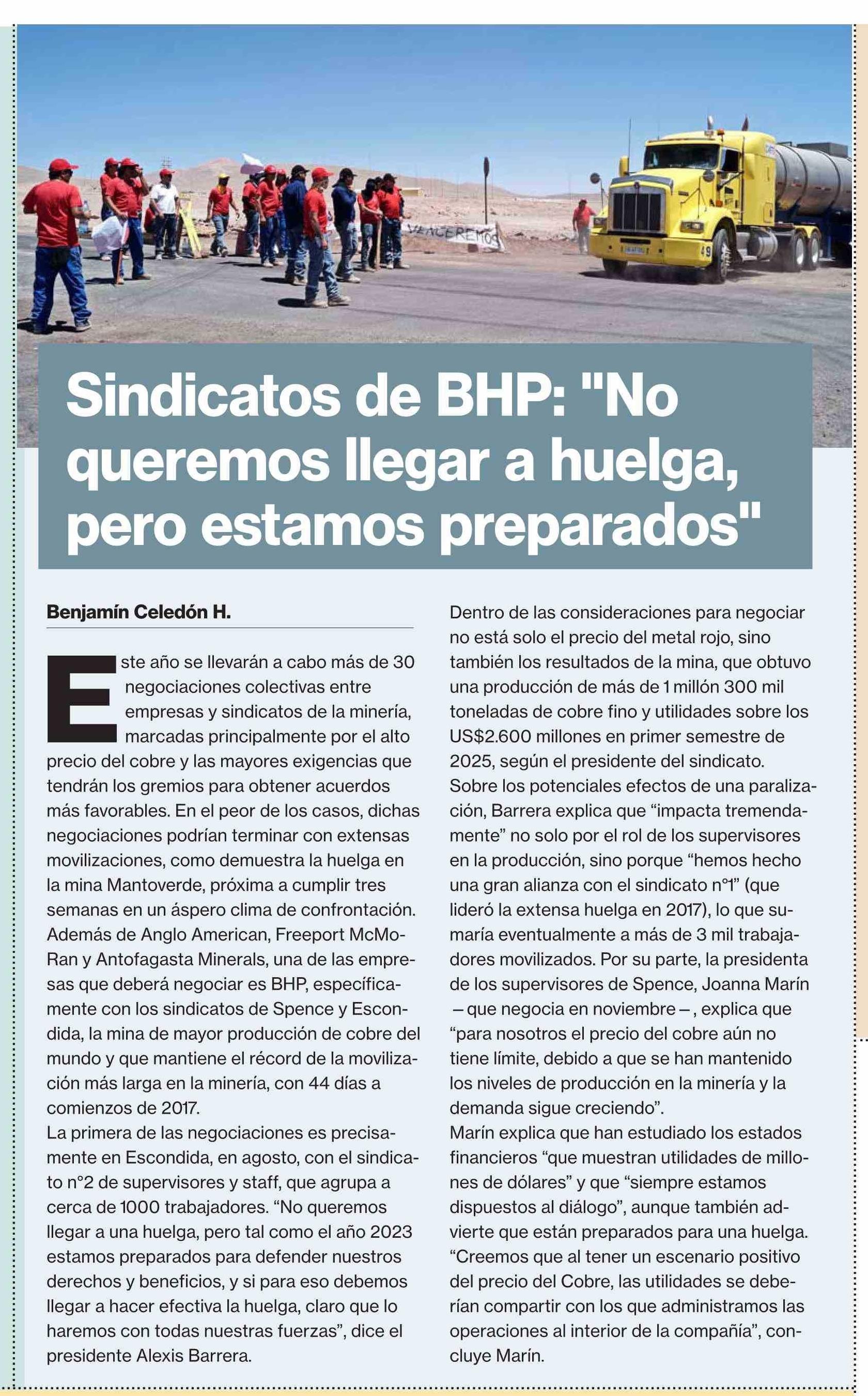 | Título: | Sindicatos de BHP: "No queremos llegar a huelga, pero estamos preparados" |