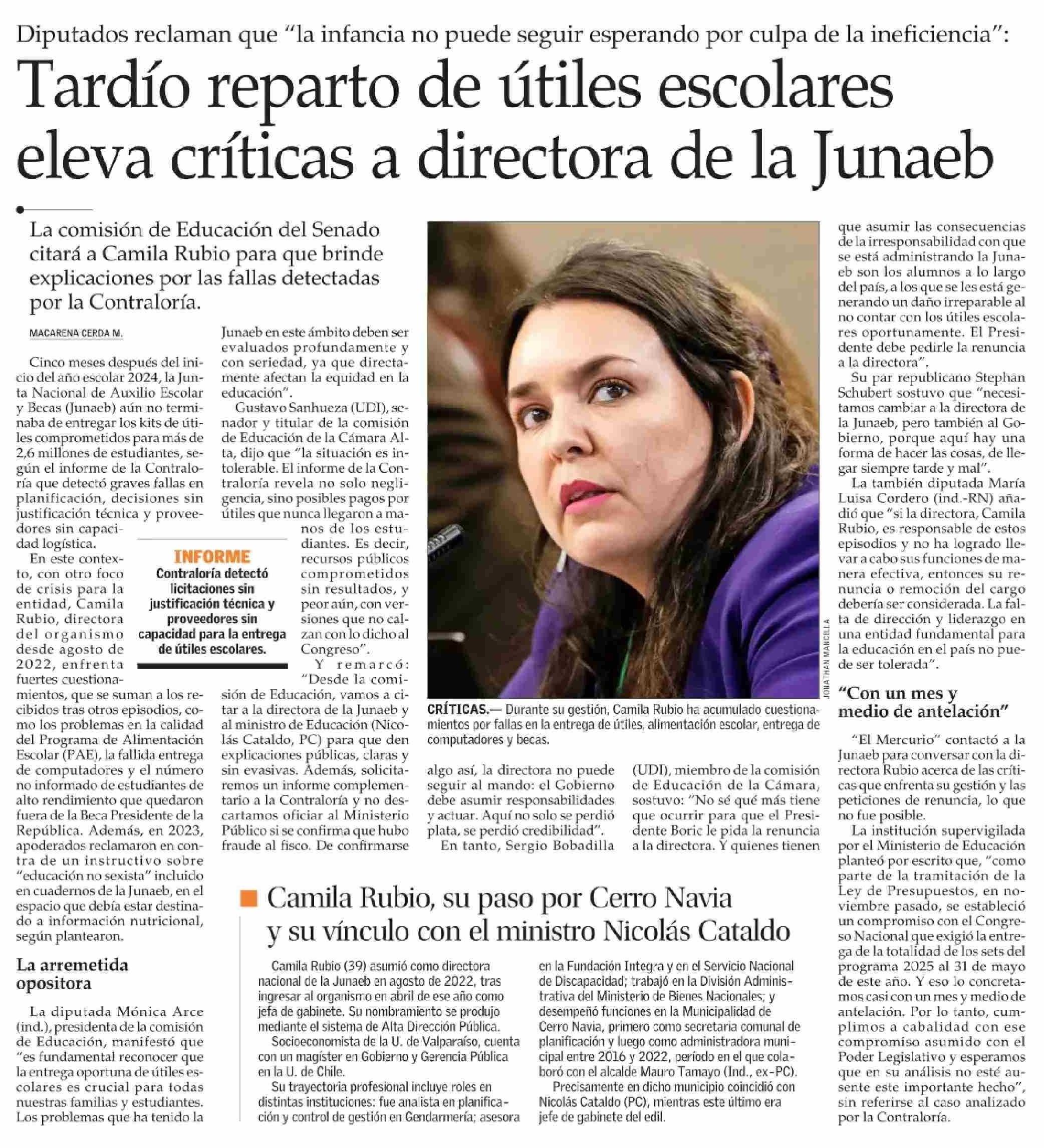 Tardío reparto de útiles escolares de la Junaeb eleva críticas a directora 19-06-2025 El Mercurio |