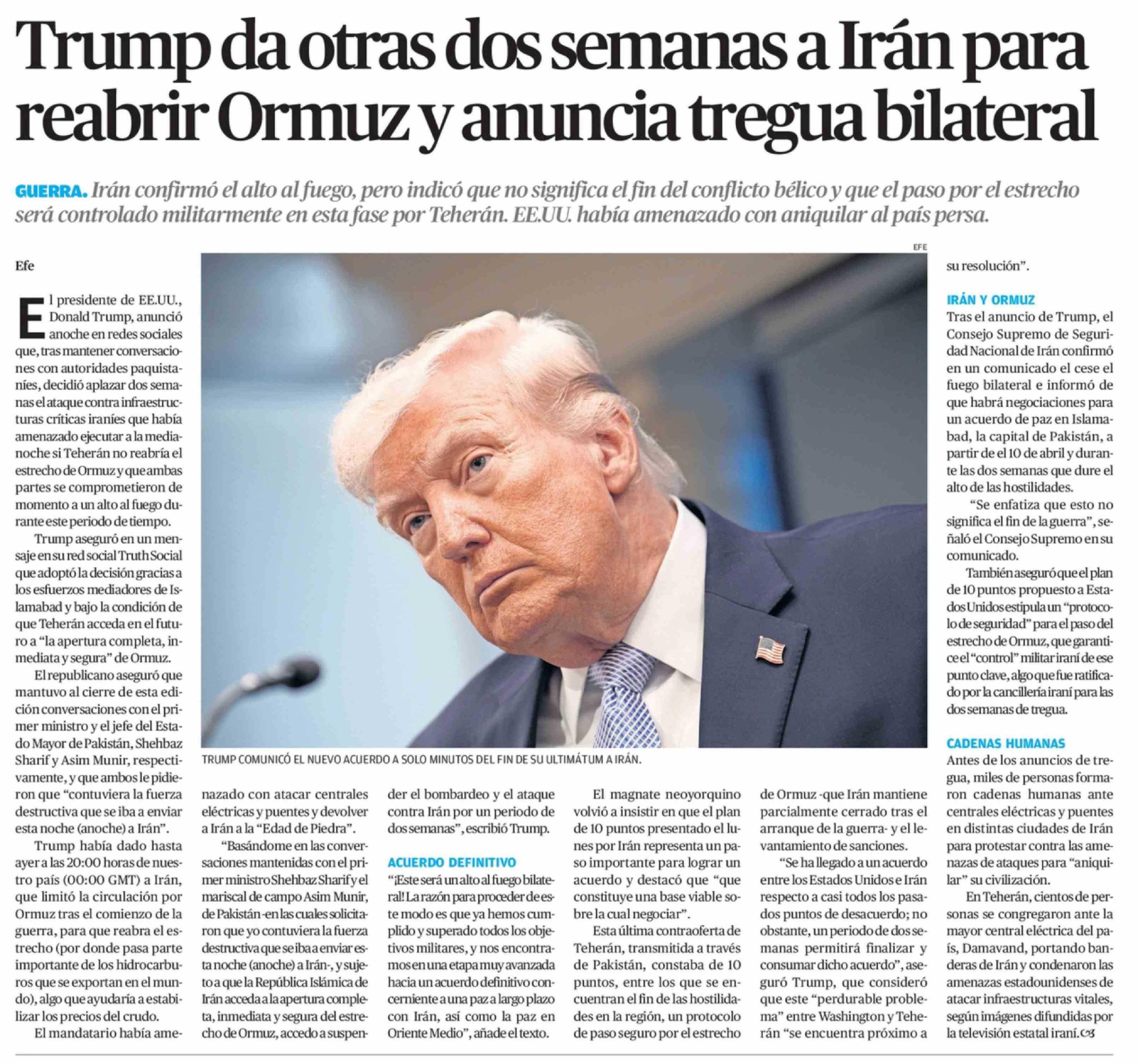 | Título: | Trump da otras dos semanas a Irán para reabrir Ormuz y anuncia tregua bilateral |