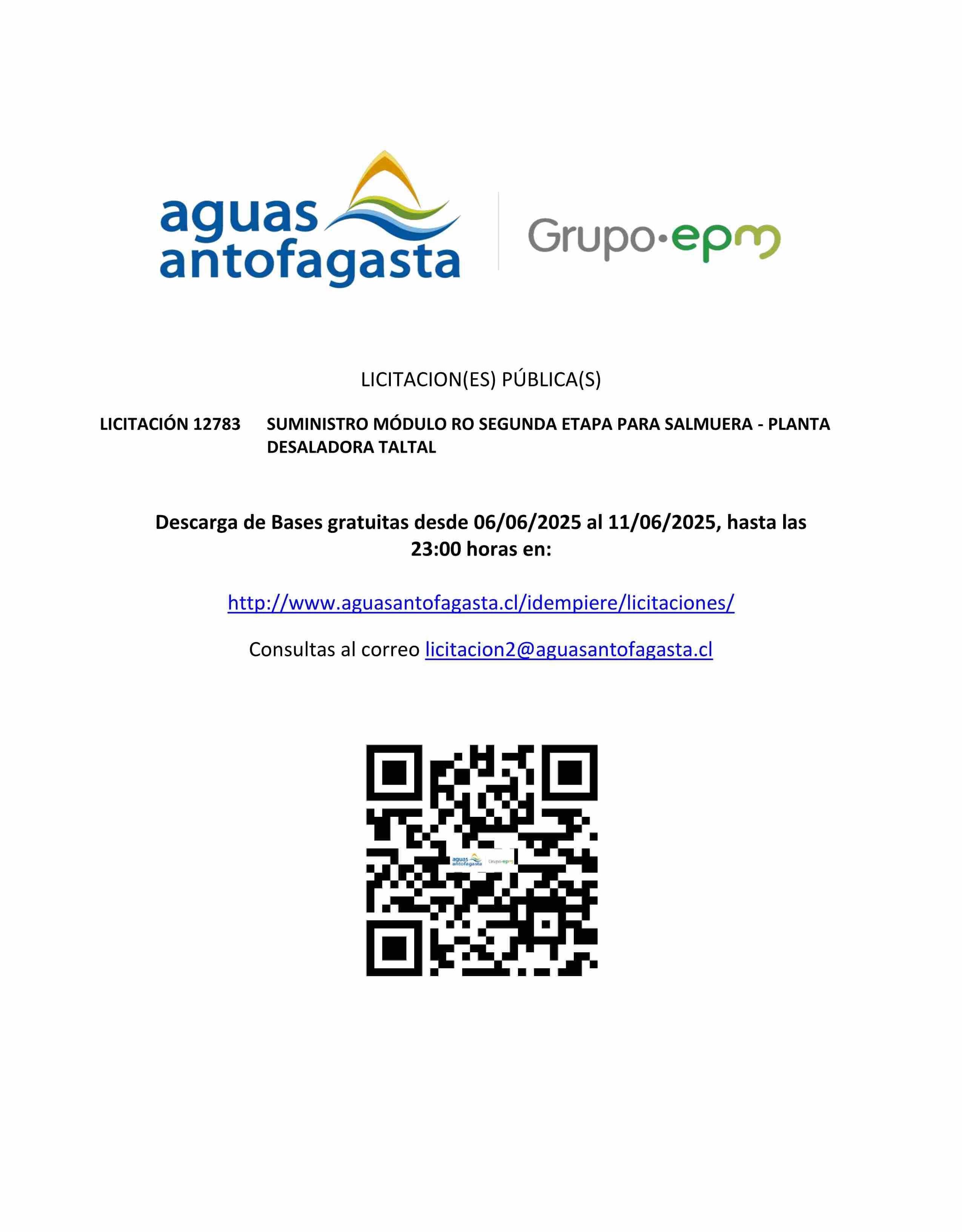 AVISO LICITACIONES: LICITACIÓN 12783 SUMINISTRO MÓDULO RO SEGUNDA ETAPA PARA SALMUERA - PLANTA DESALADORA TALTAL 09-06-2025 El Mostrador - Avisos Legales |