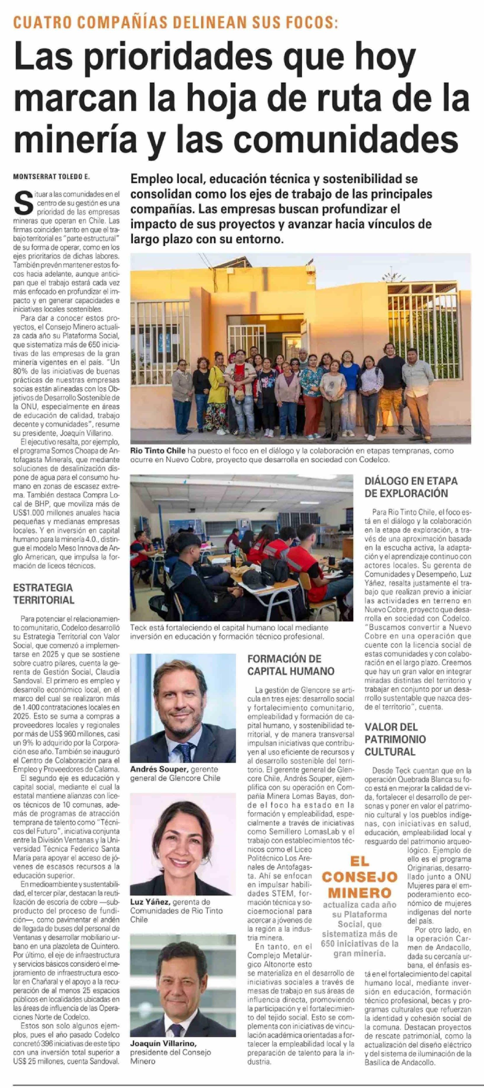 Las prioridades que hoy marcan la hoja de ruta de la minería y las comunidades 22-04-2026 El Mercurio |