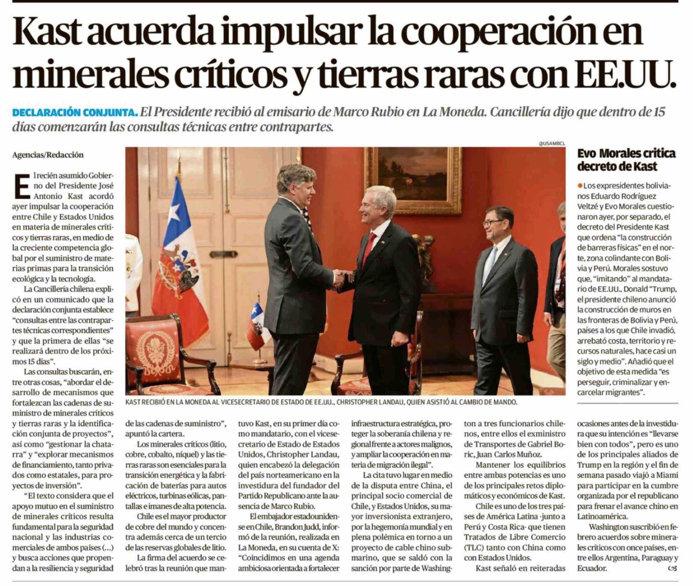 Título: Kast acuerda impulsar la cooperación en minerales críticos y tierras raras con EE.UU.