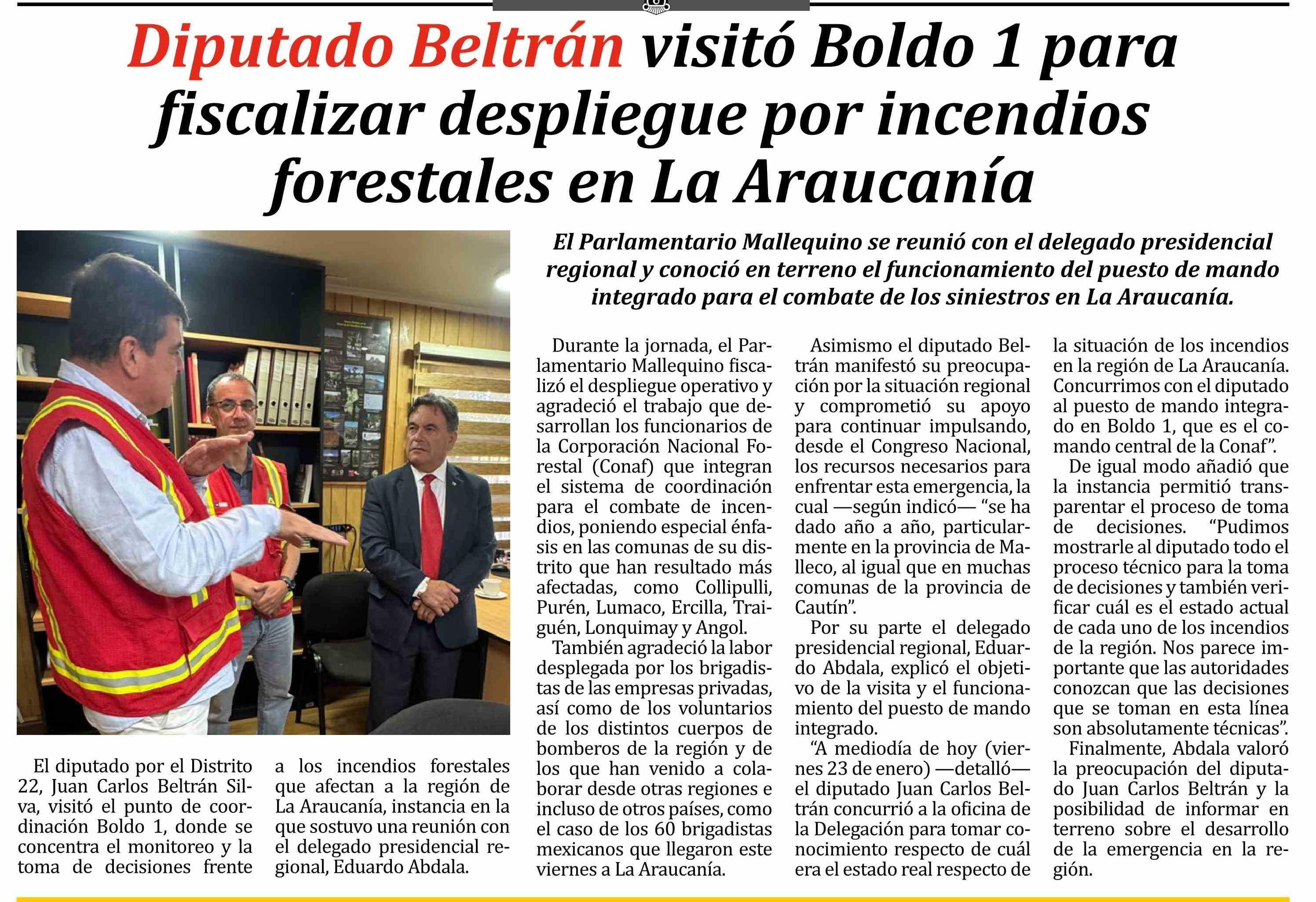 Título: Diputado Beltrán visitó Boldo 1 para fiscalizar despliegue por incendios forestales en La Araucania