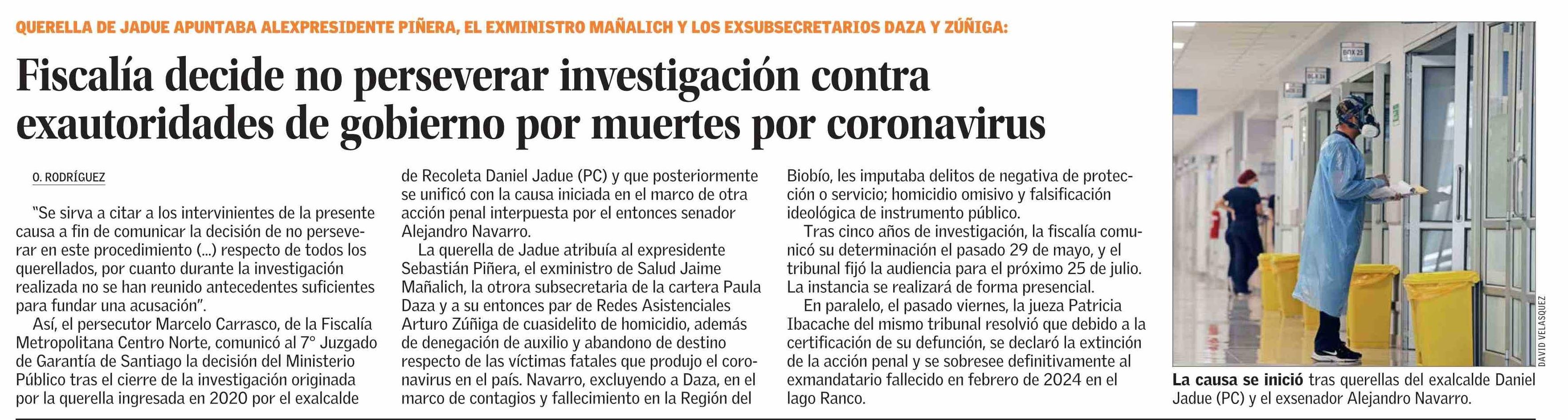 Fiscalía decide no perseverar investigación contra exautoridades de gobierno por muertes por coronavirus 05-06-2025 El Mercurio |