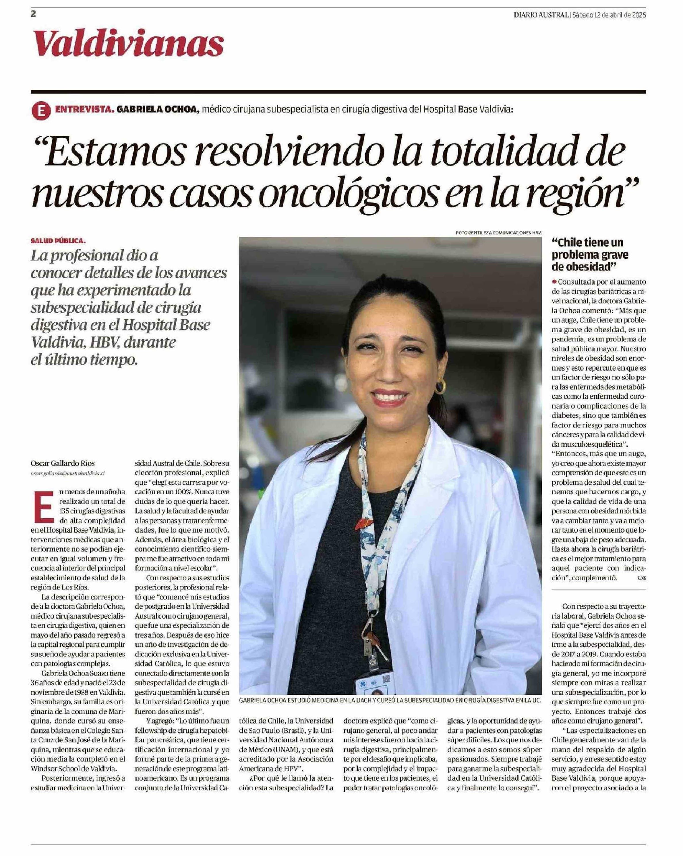 "Estamos resolviendo la totalidad de nuestros casos oncológicos en la región" 12-04-2025 Diario Austral Región de Los Ríos |