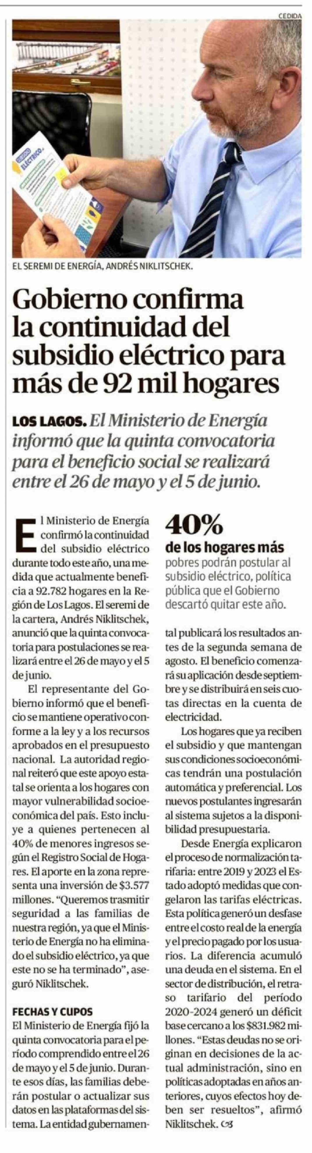 Título: Gobierno confirma la continuidad del subsidio eléctrico para más de 92 mil hogares