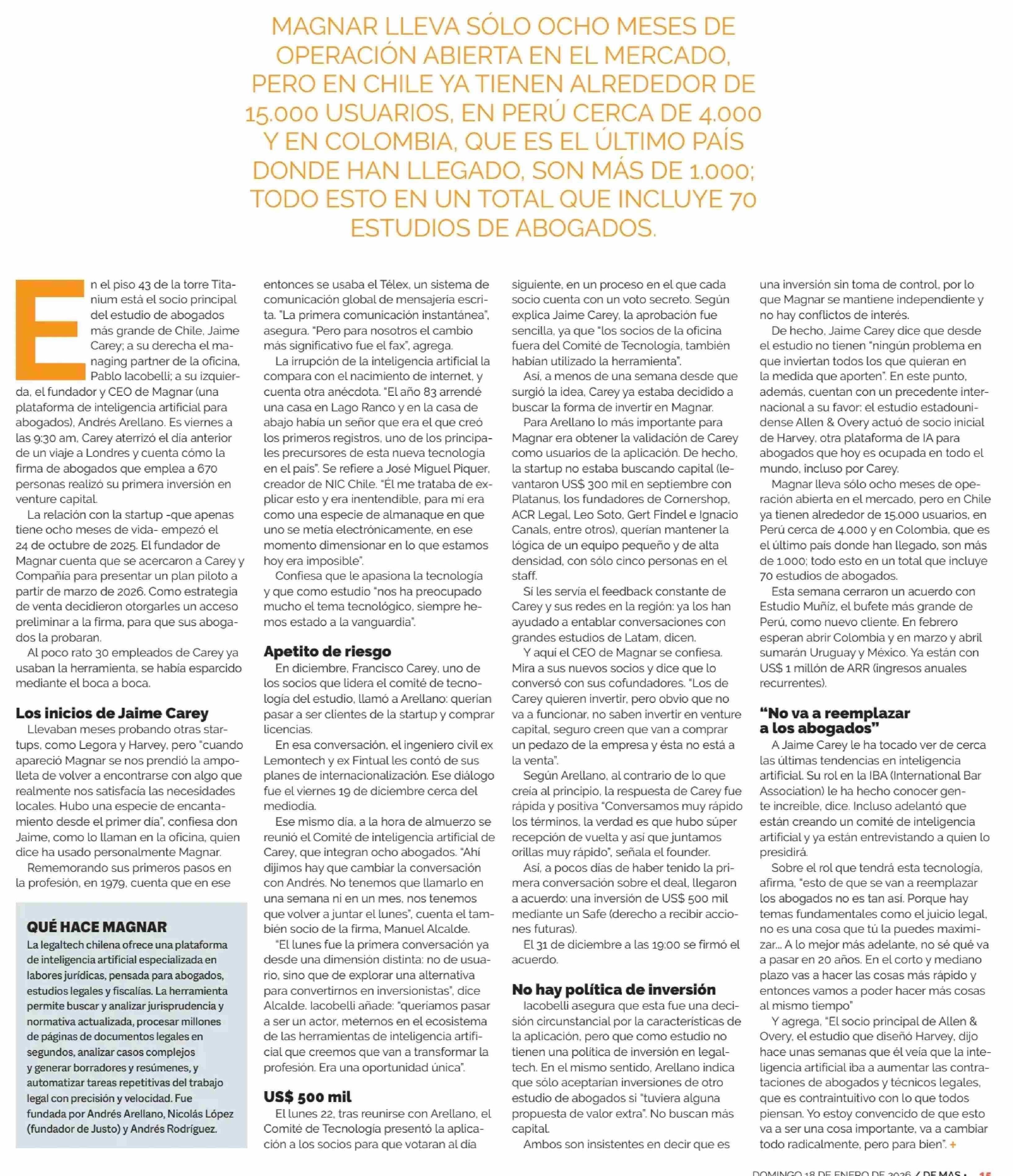 CAREY ENTRA AL MUNDO STARTUP E INVIERTE US$ 500 MIL EN LEGALTECH MAGNAR 18-01-2026 Diario Financiero |